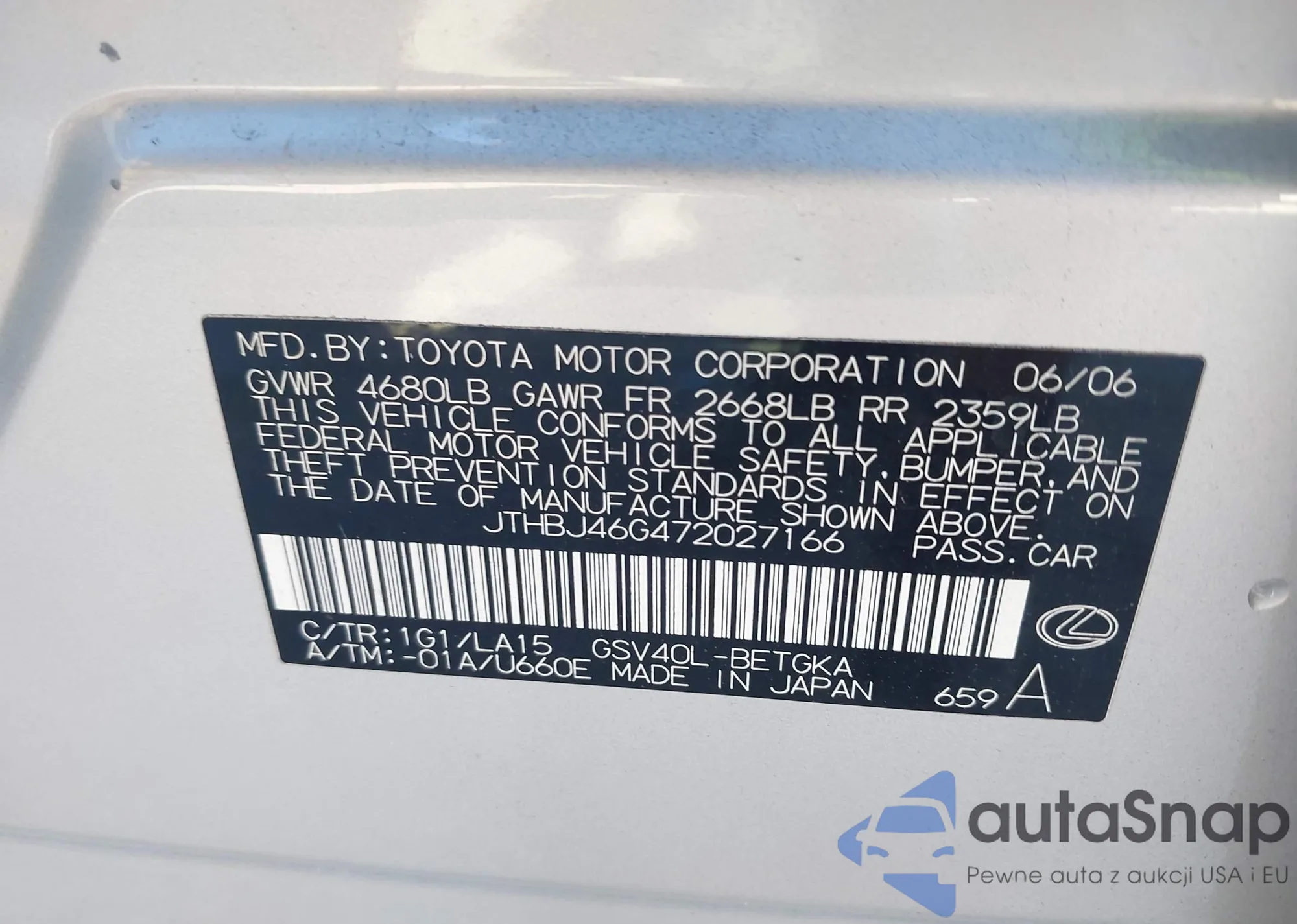 LOT: 43717662 VIN: JTHBJ46G472027166