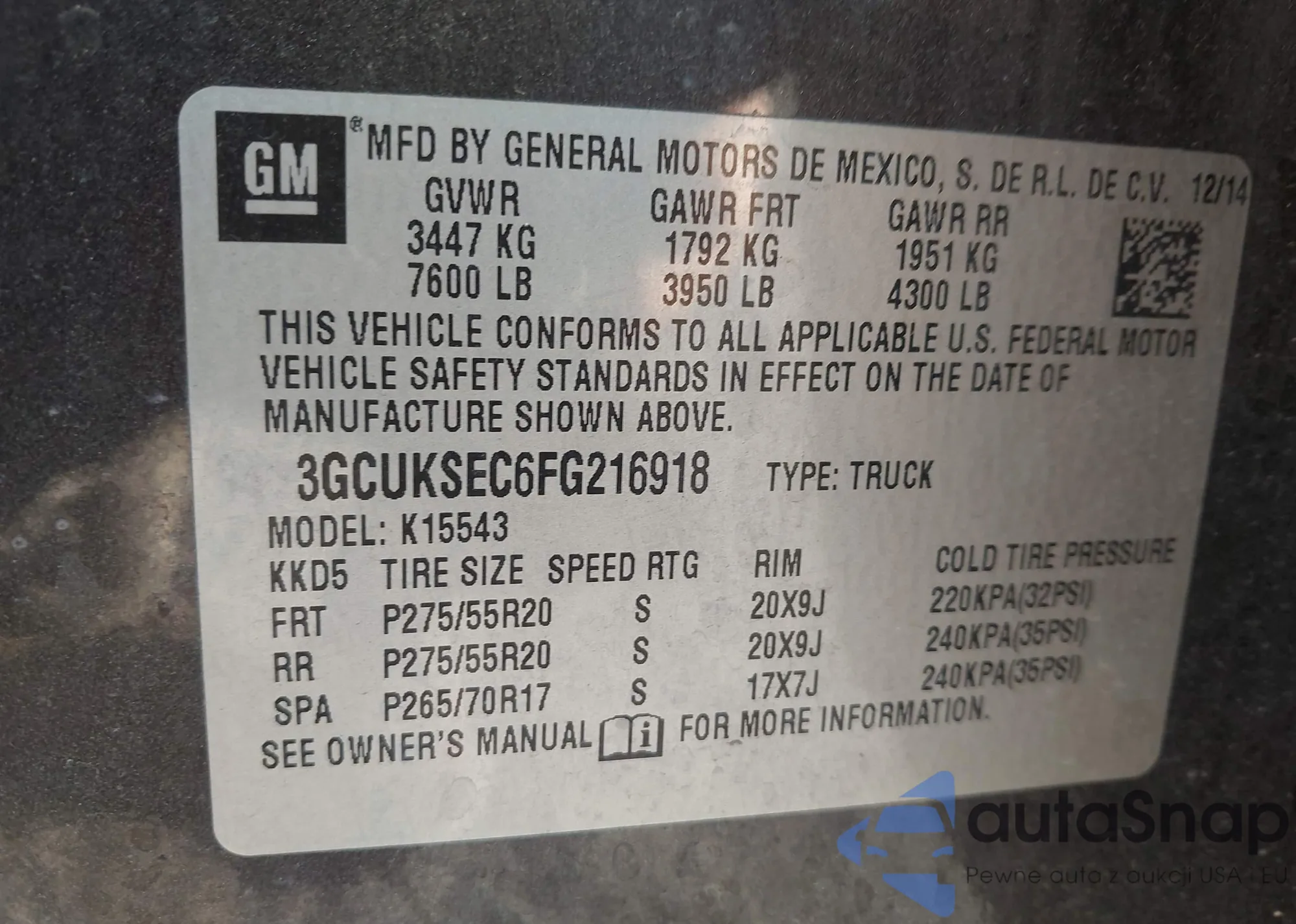 LOT: 43364166 VIN: 3GCUKSEC6FG216918