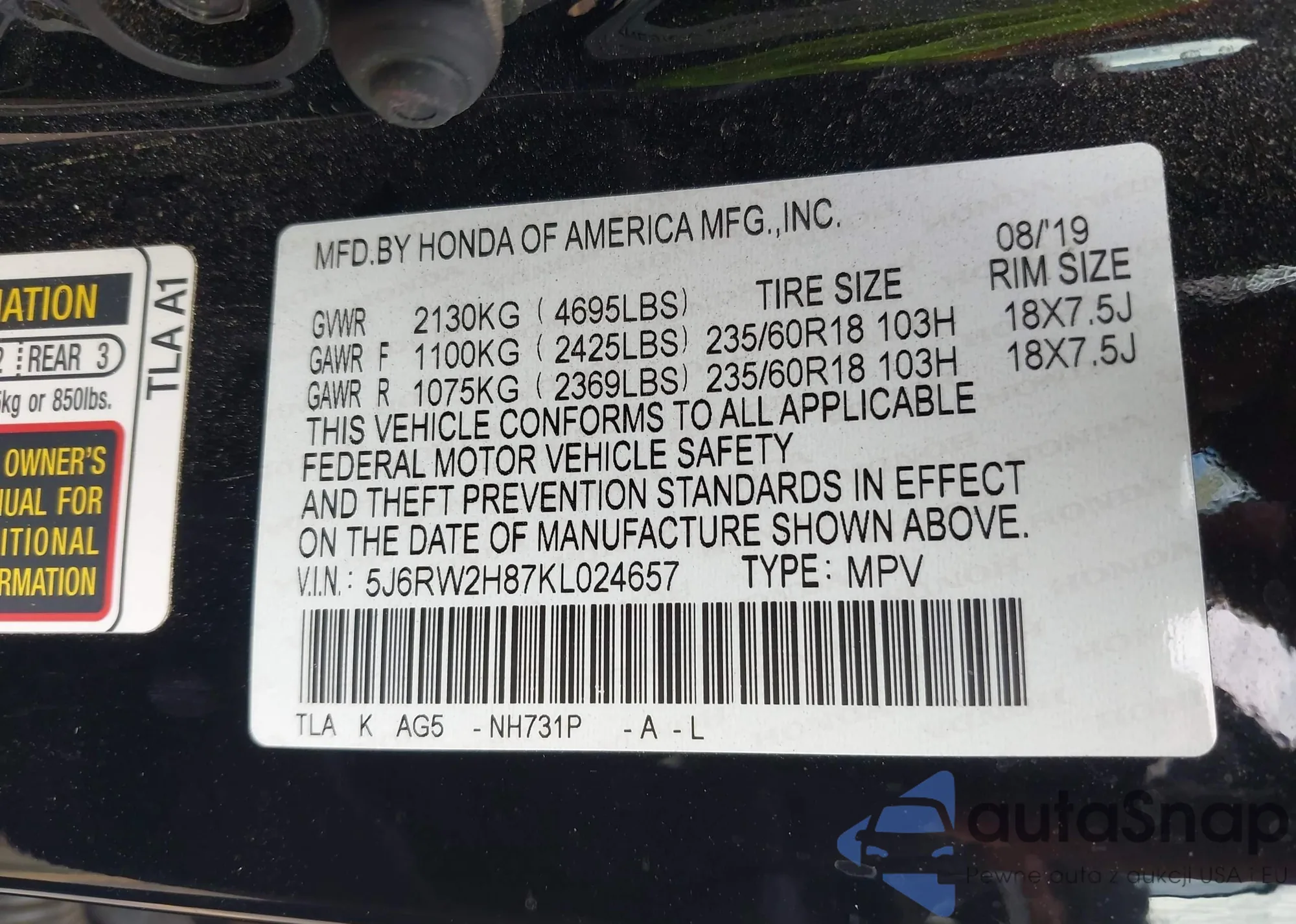 • VIN 5J6RW2H87KL024657