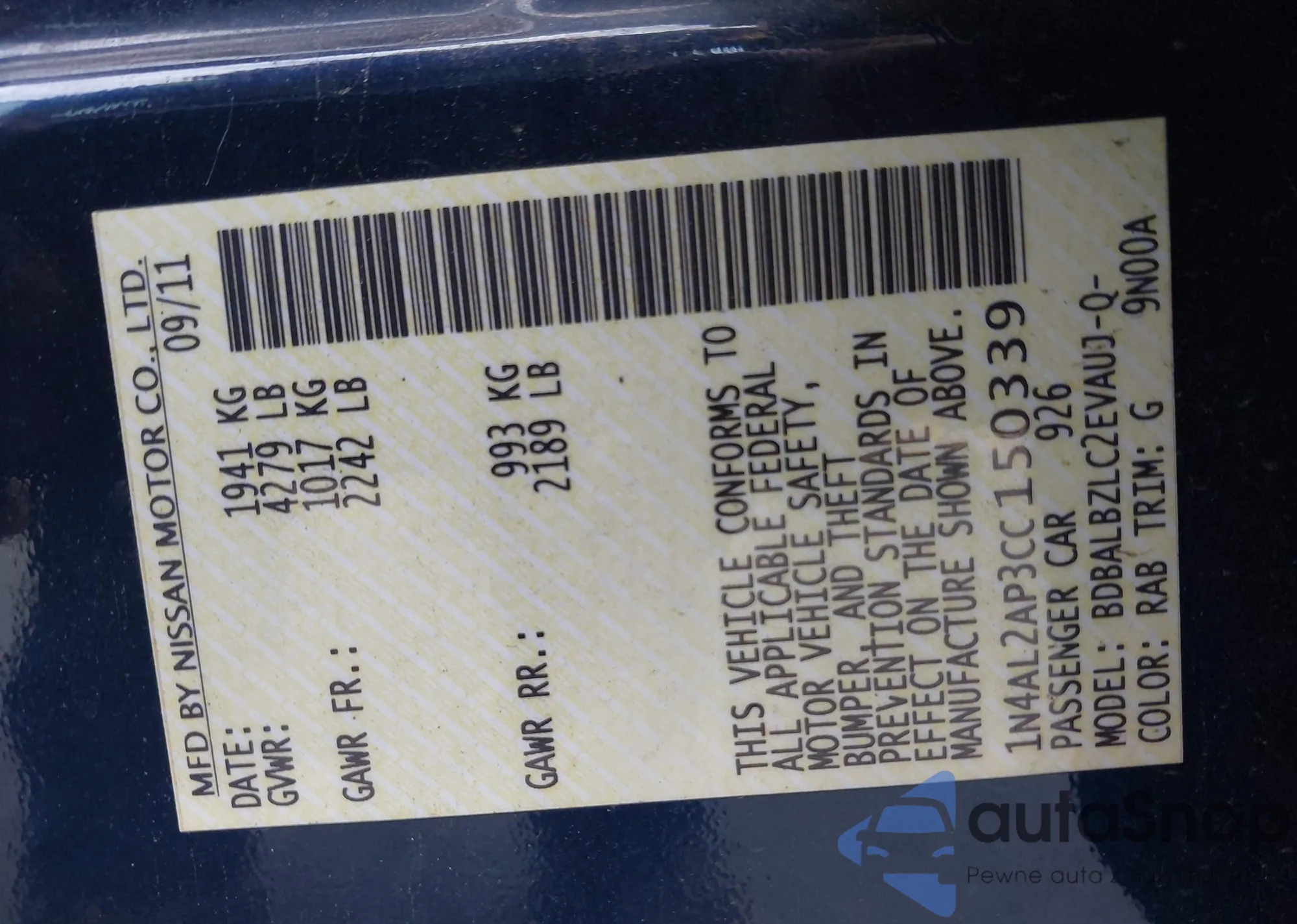 LOT: 43627928 VIN: 1N4AL2AP3CC150339