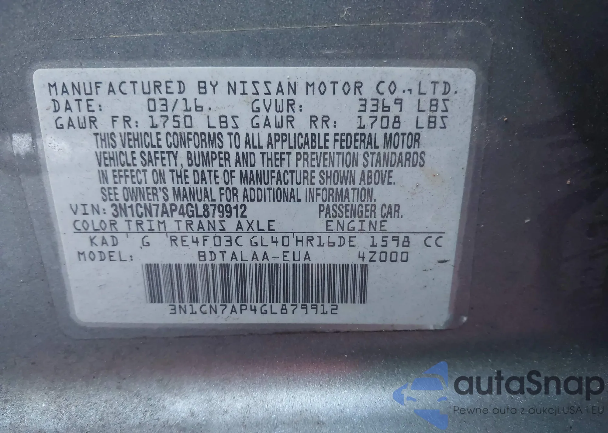 LOT: 43801023 VIN: 3N1CN7AP4GL879912