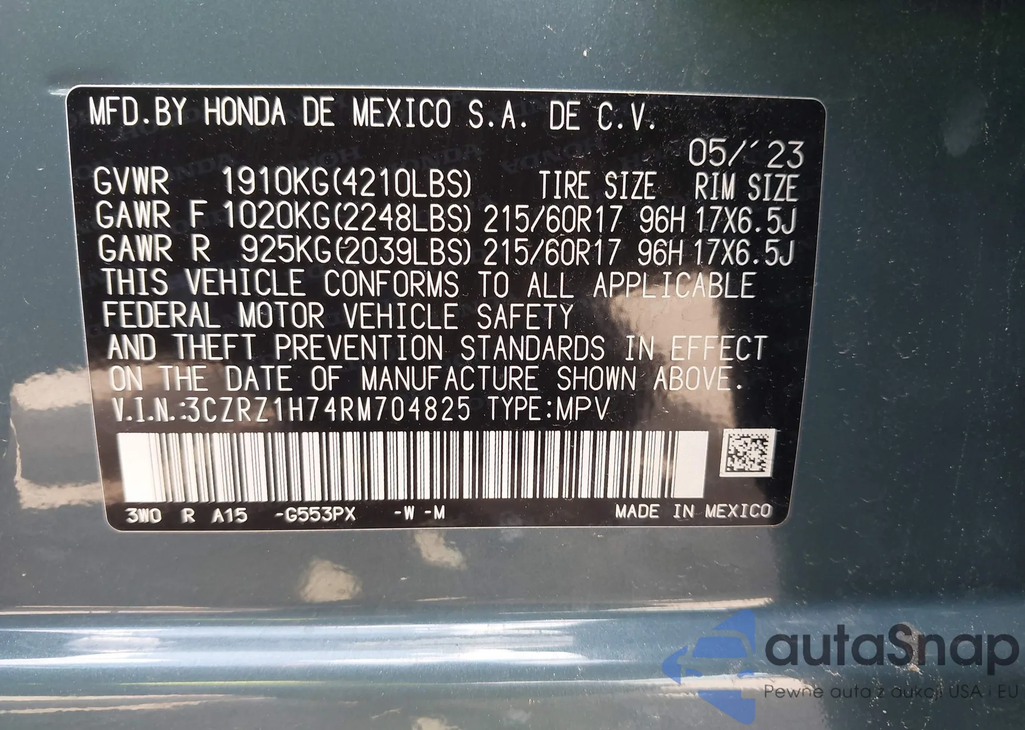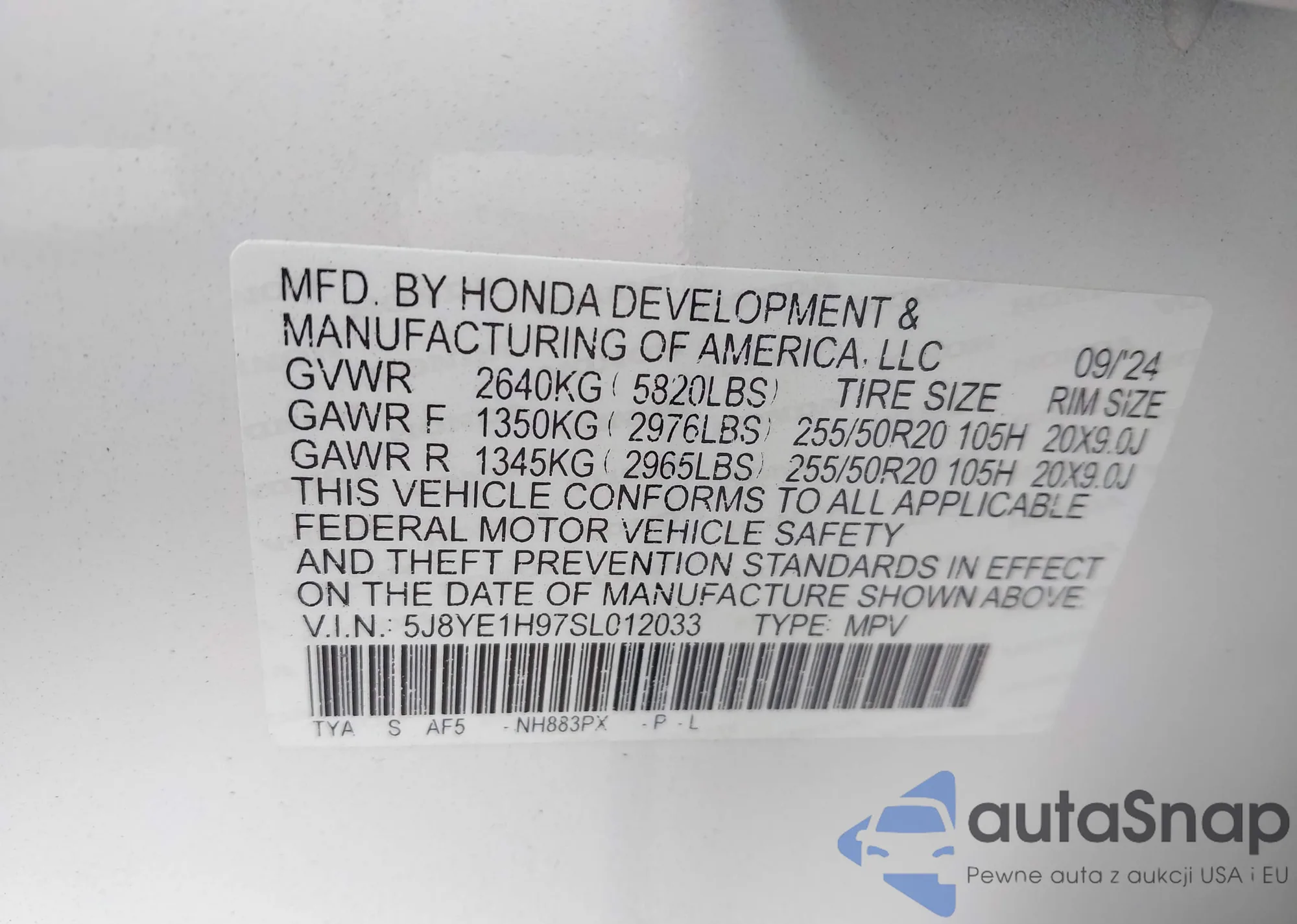 • VIN 5J8YE1H97SL012033