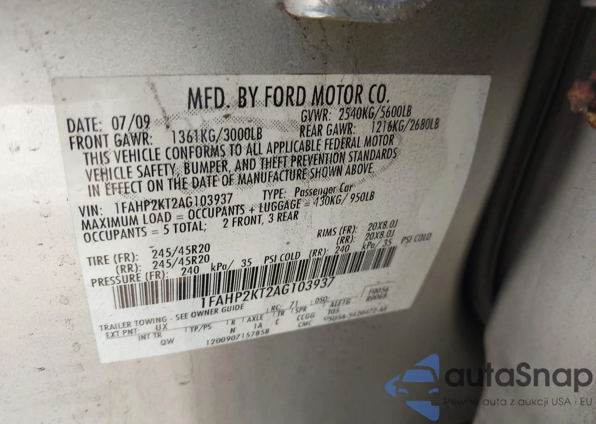 LOT: 43411737 VIN: 1FAHP2KT2AG103937
