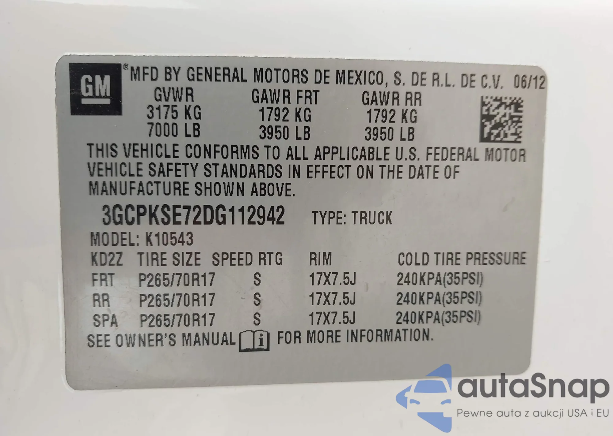LOT: 42868334 VIN: 3GCPKSE72DG112942