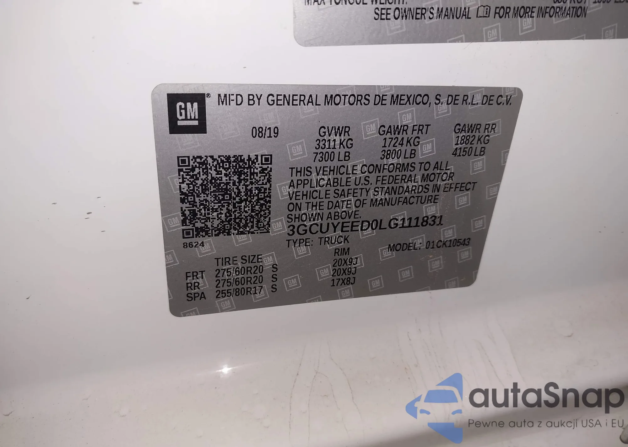 LOT: 43262442 VIN: 3GCUYEED0LG111831