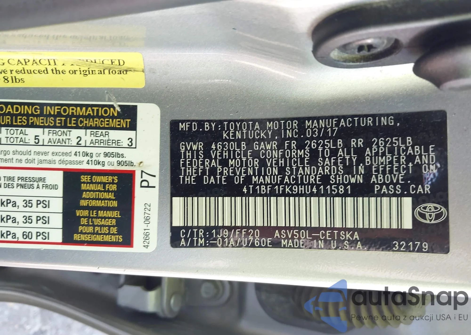 • VIN 4T1BF1FK9HU411581