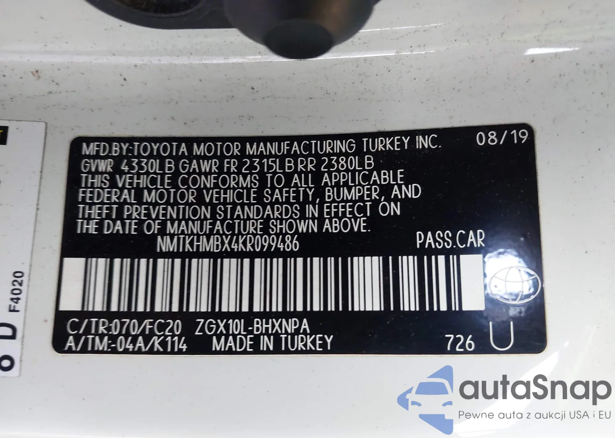 LOT: 43678331 VIN: NMTKHMBX4KR099486
