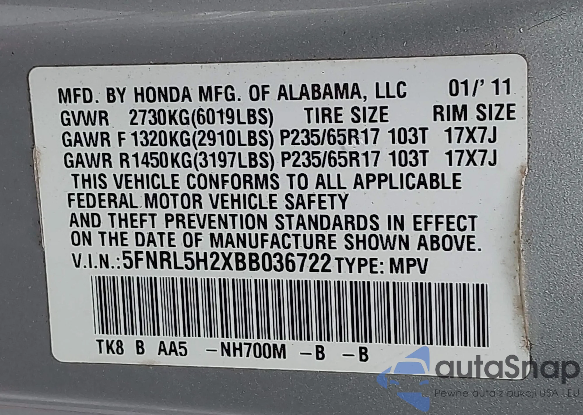 • VIN 5FNRL5H2XBB036722