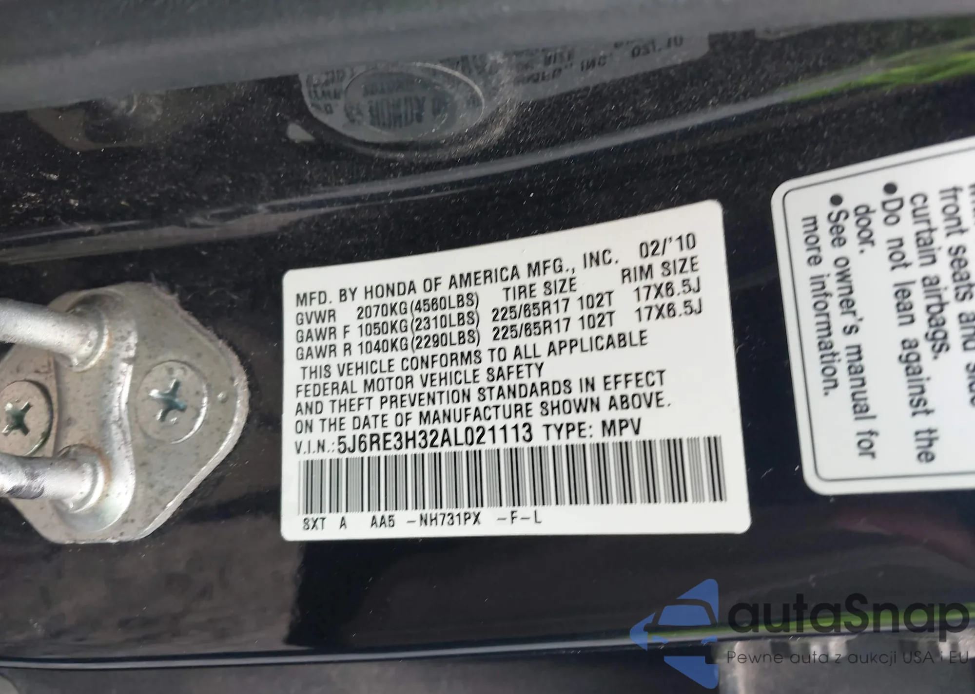 • VIN 5J6RE3H32AL021113