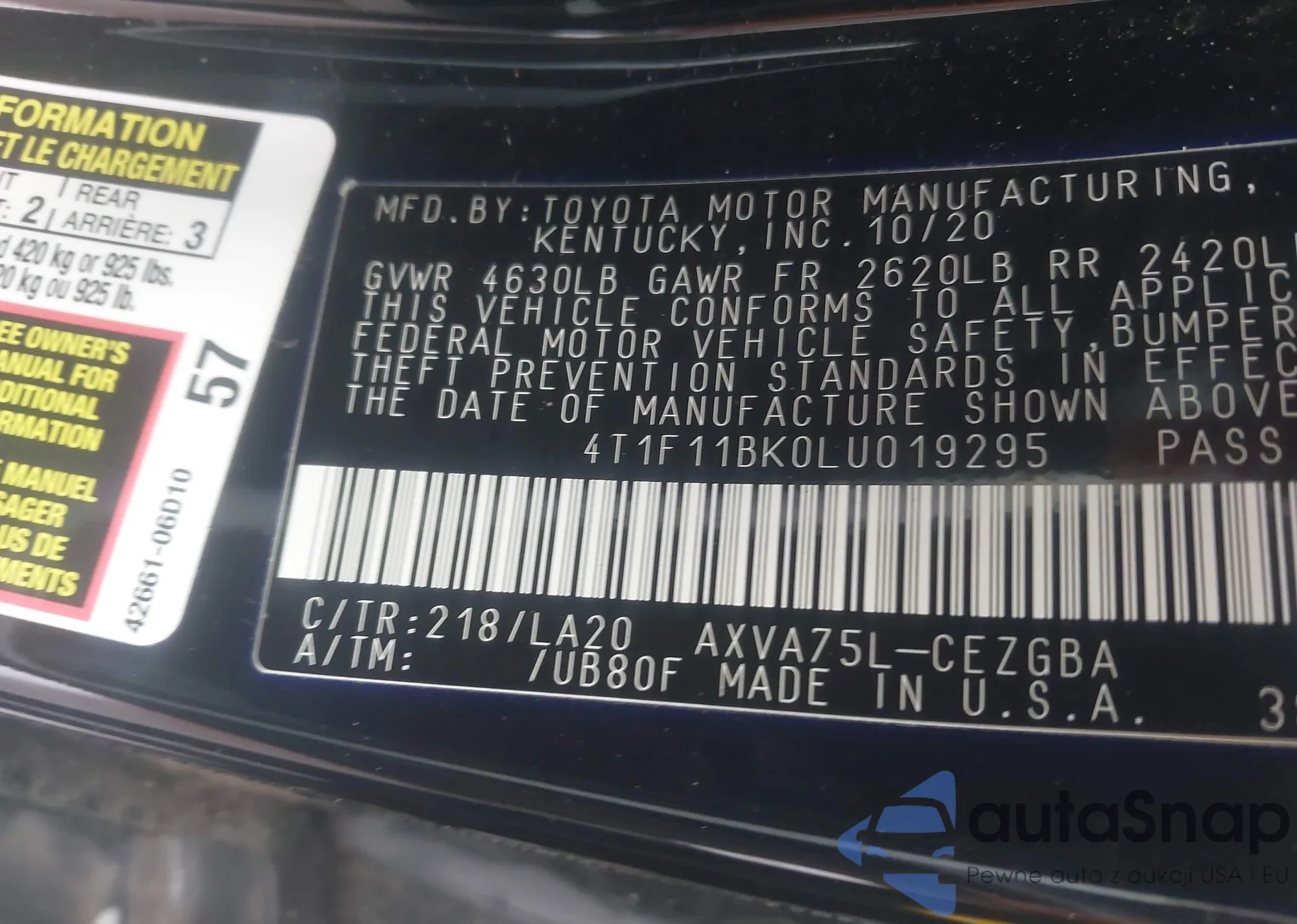 • VIN 4T1F11BK0LU019295