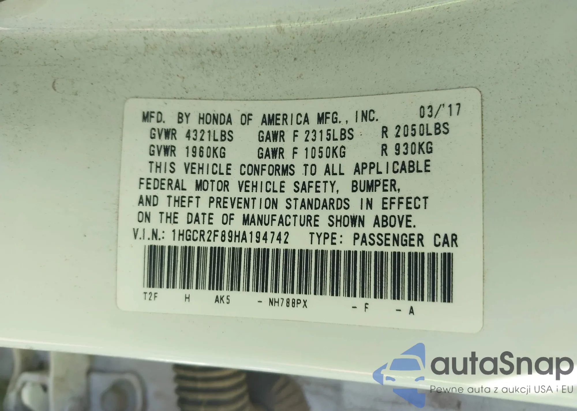• VIN 1HGCR2F89HA194742