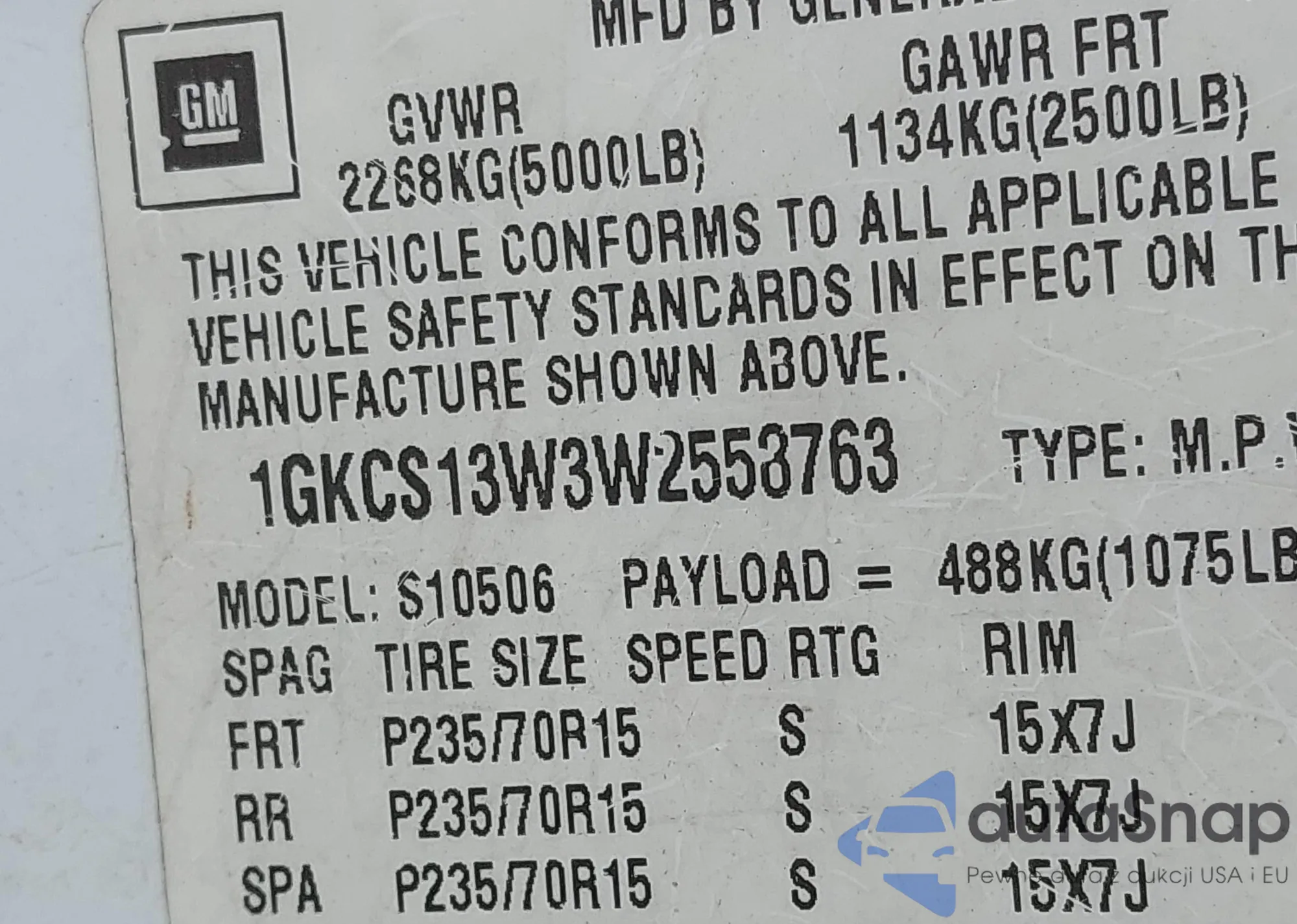 • VIN 1GKCS13W3W2558763