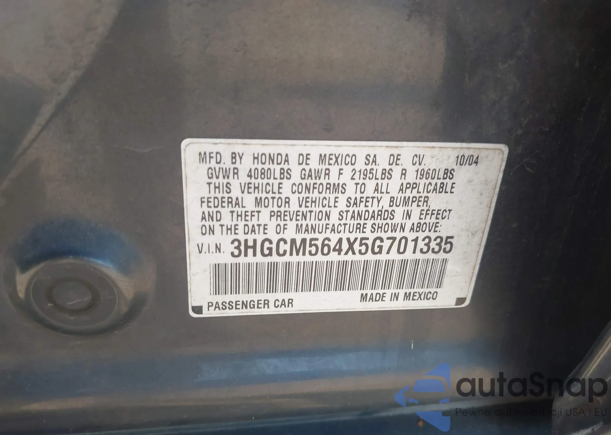 • VIN 3HGCM564X5G701335
