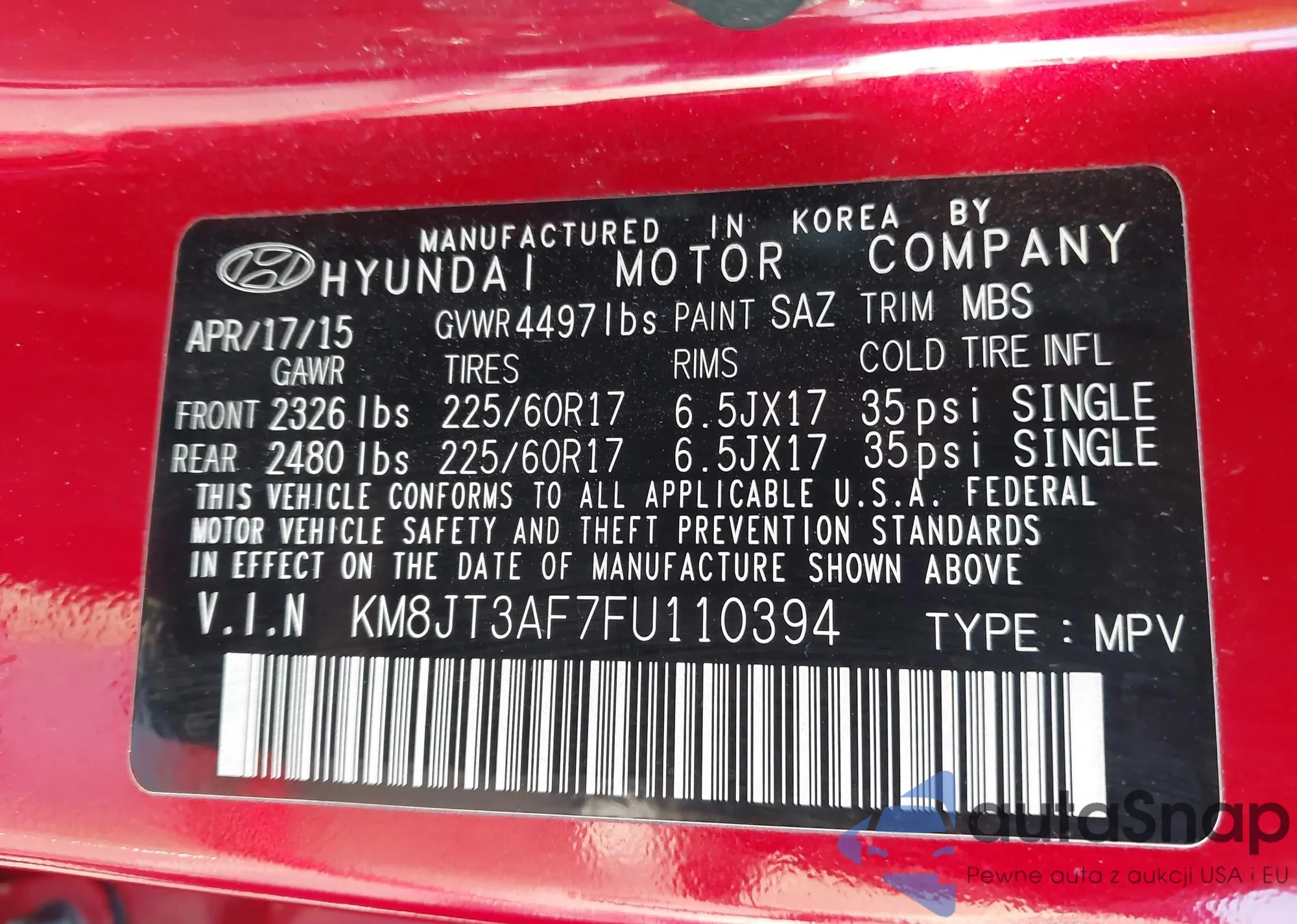 LOT: 43504496 VIN: KM8JT3AF7FU110394