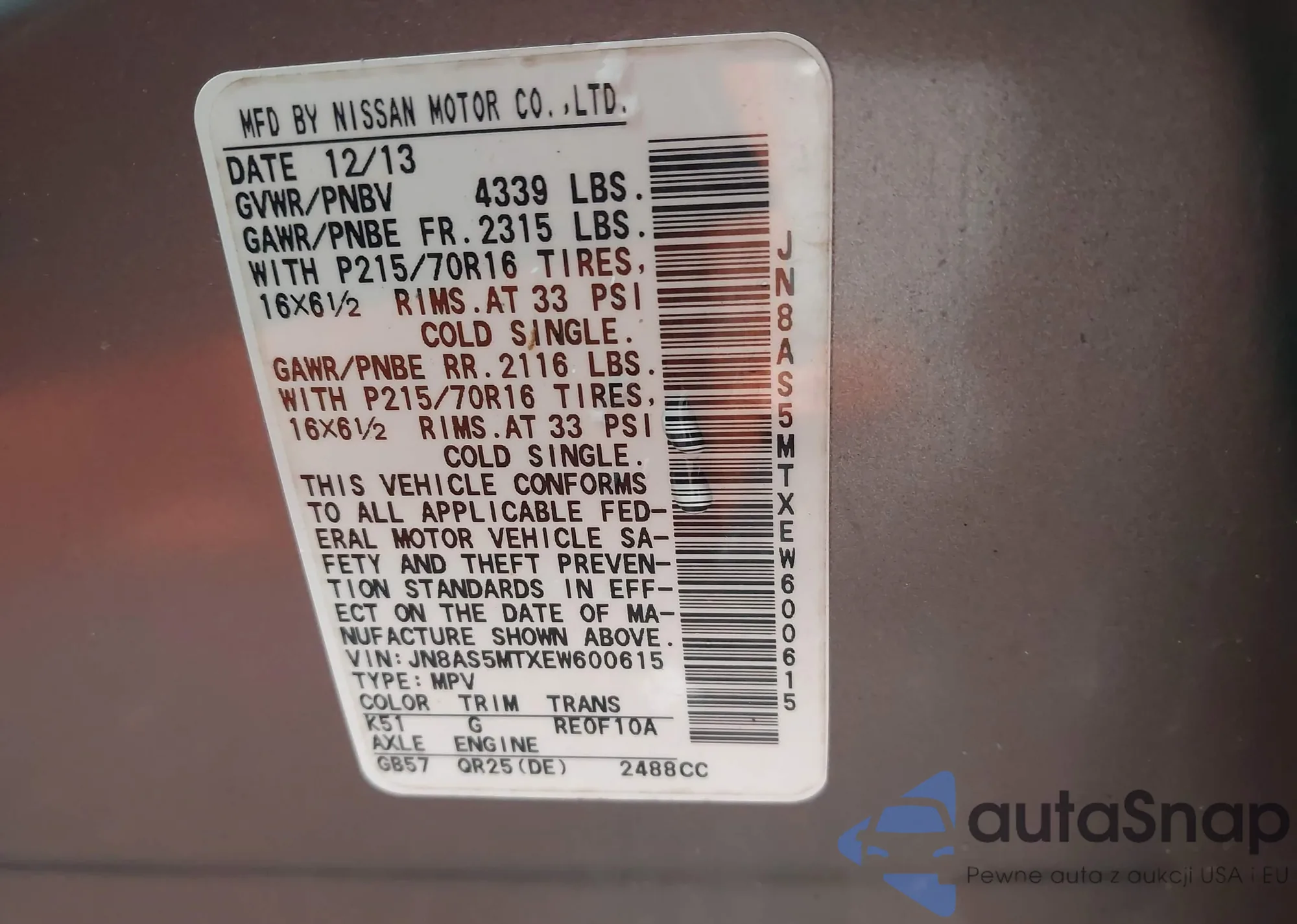 • VIN JN8AS5MTXEW600615