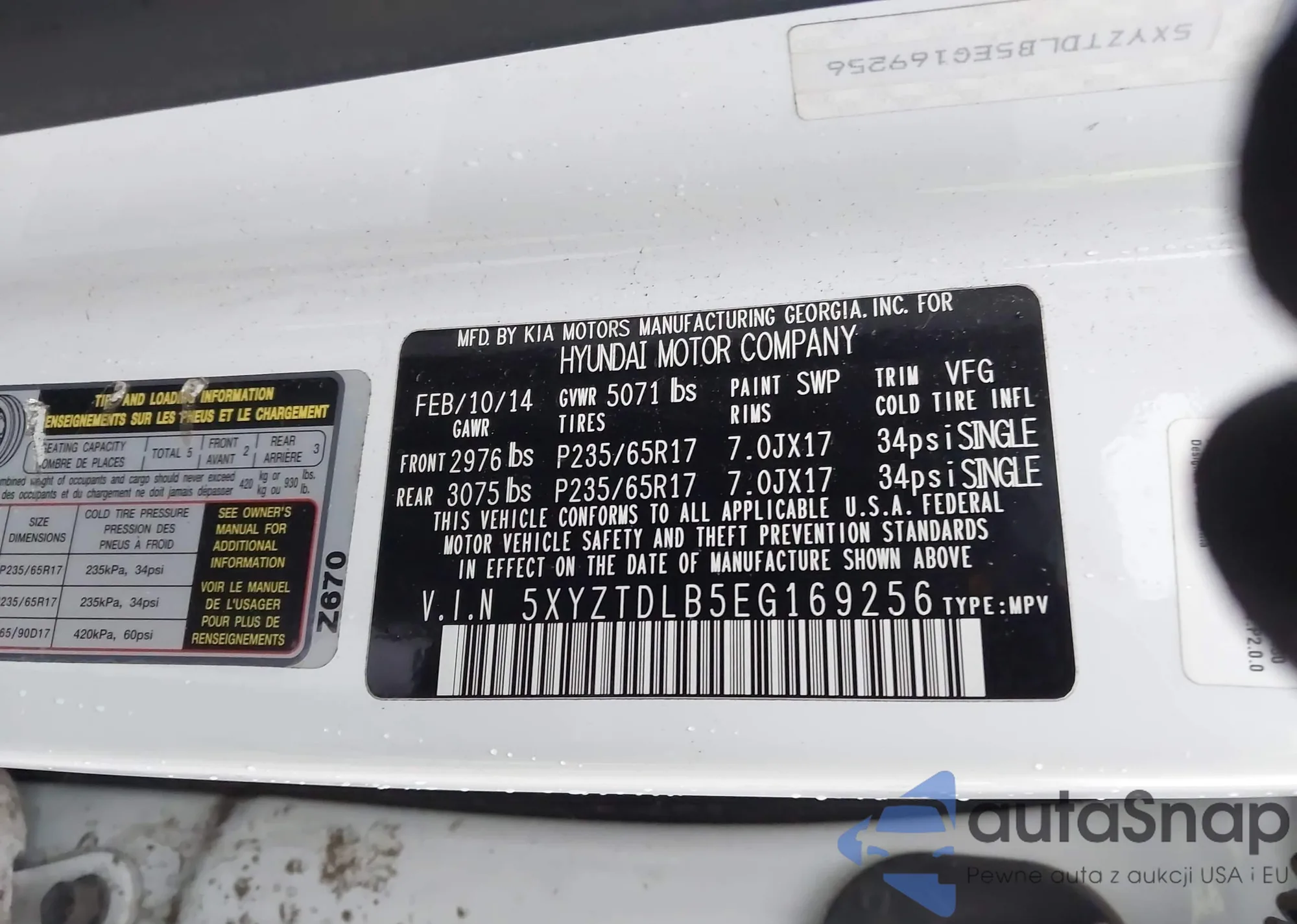 • VIN 5XYZTDLB5EG169256