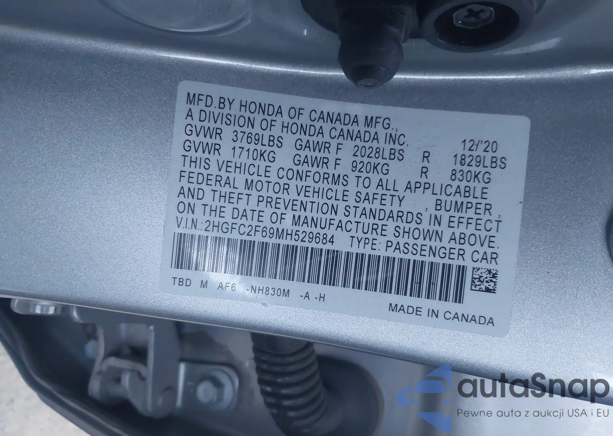 LOT: 43791007 VIN: 2HGFC2F69MH529684