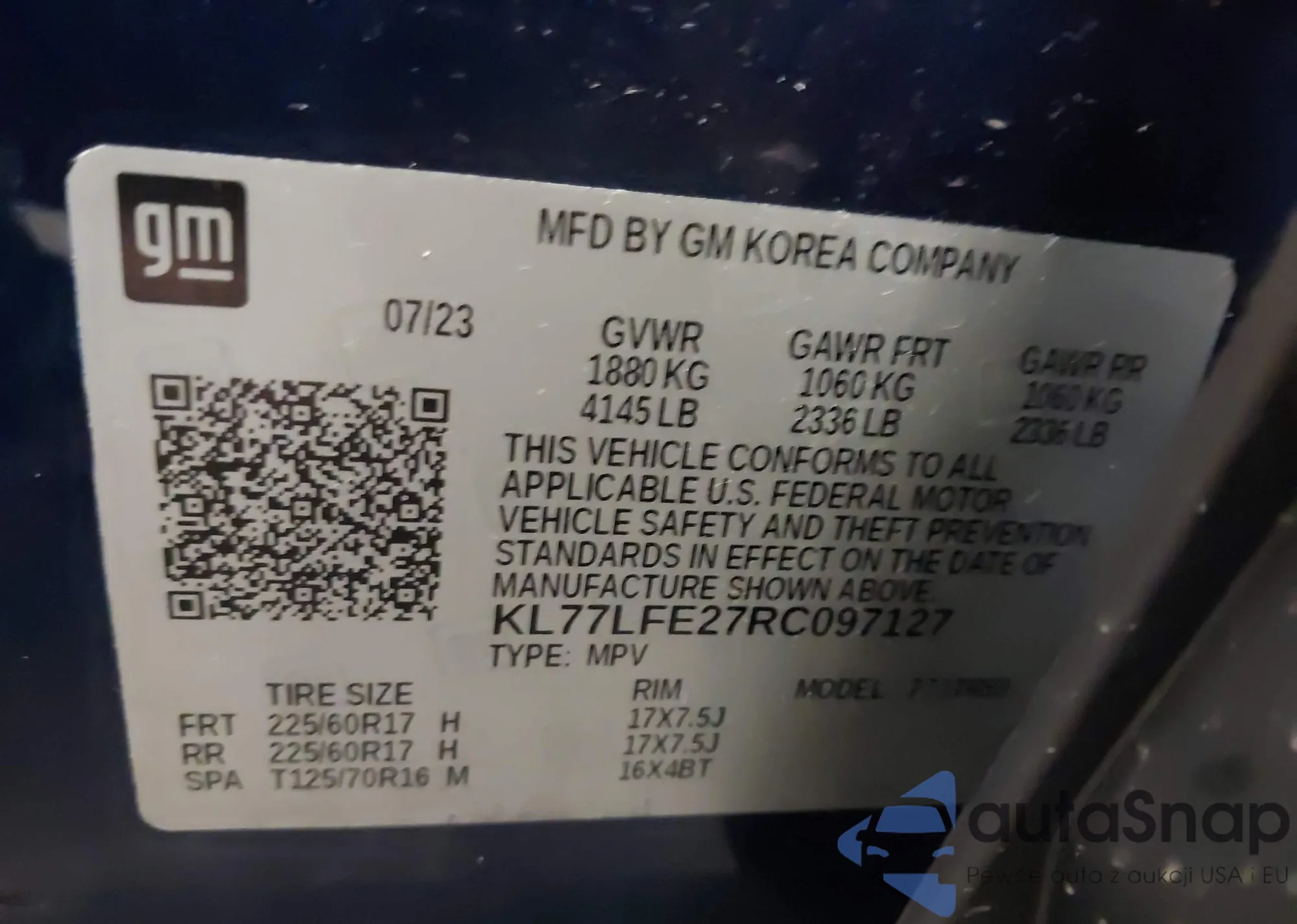 • VIN KL77LFE27RC097127
