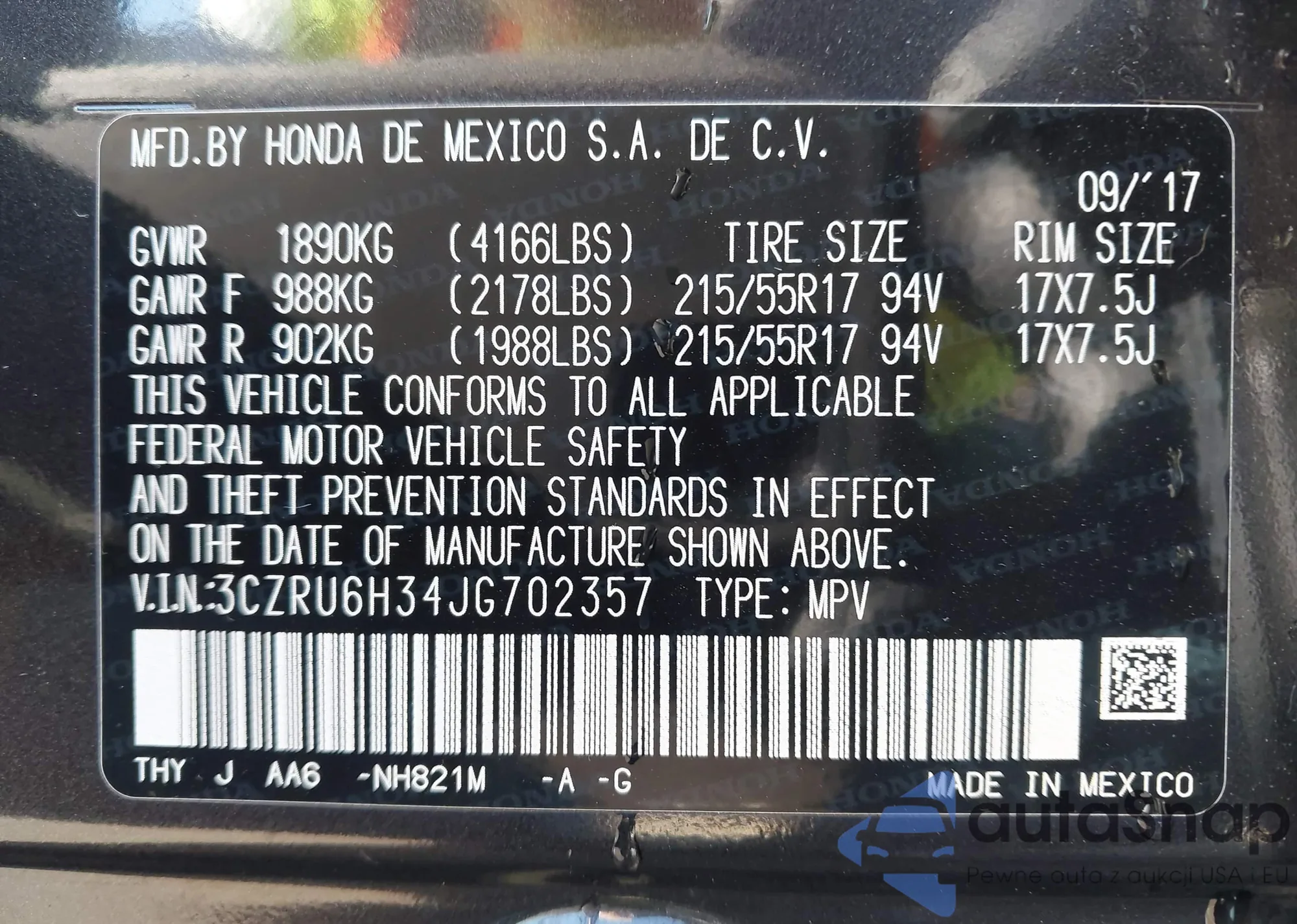 • VIN 3CZRU6H34JG702357