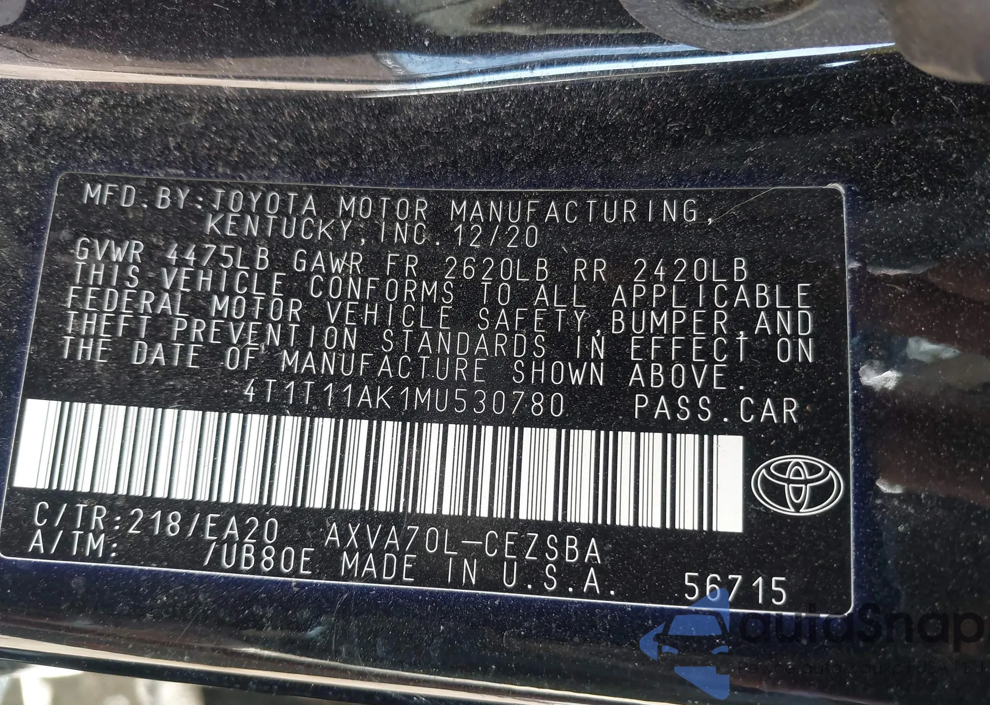 • VIN 4T1T11AK1MU530780