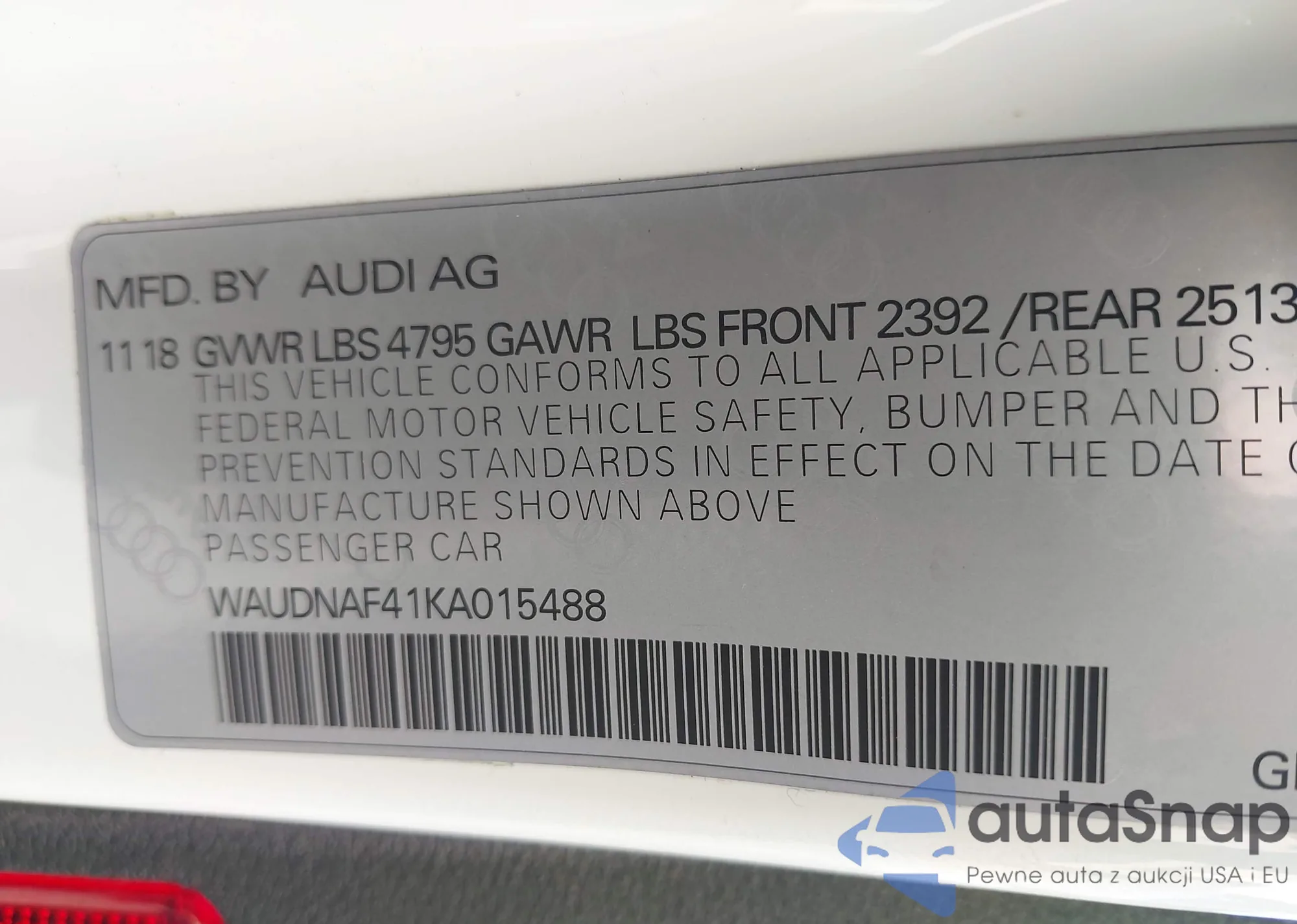 LOT: 43549342 VIN: WAUDNAF41KA015488