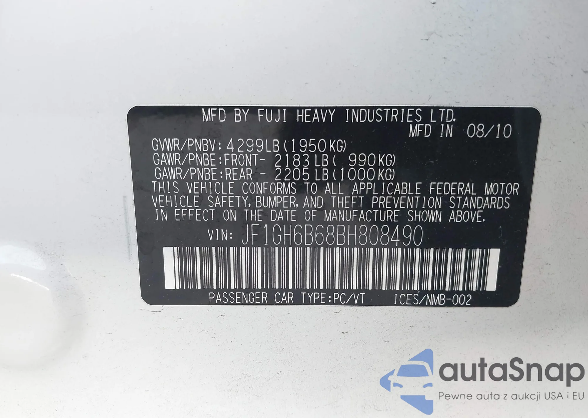 LOT: 43615081 VIN: JF1GH6B68BH808490