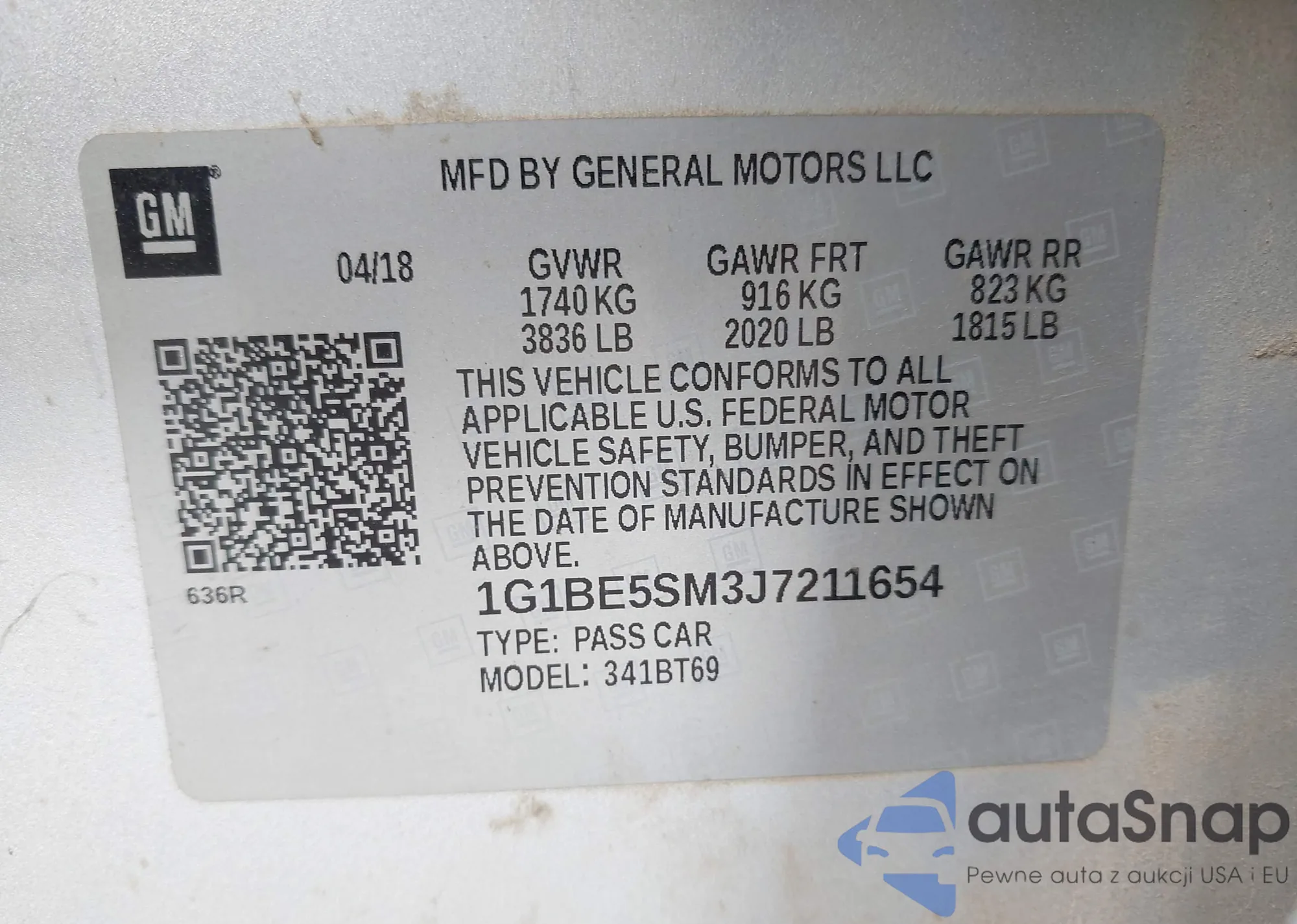 LOT: 43409221 VIN: 1G1BE5SM3J7211654