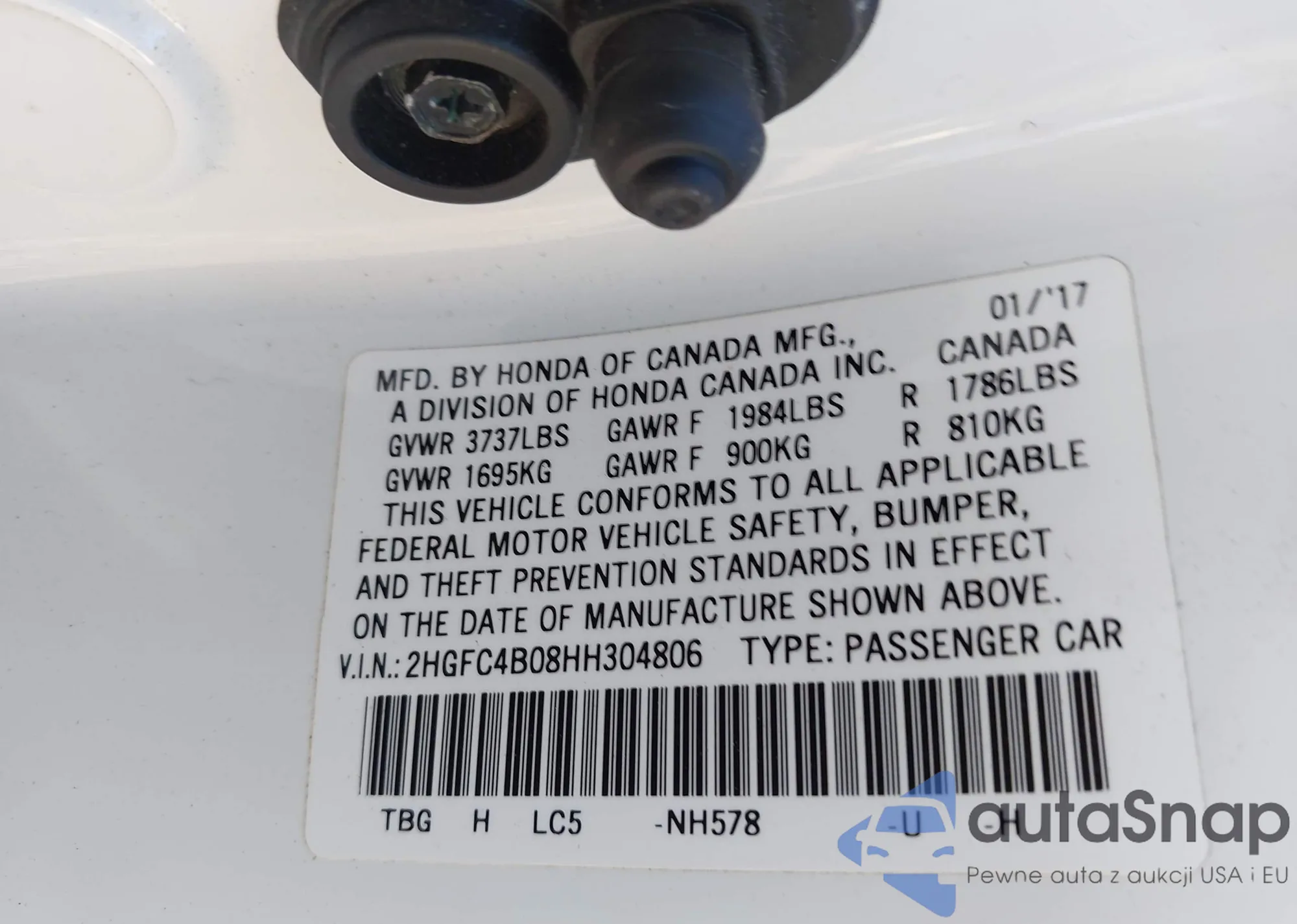 LOT: 43619713 VIN: 2HGFC4B08HH304806
