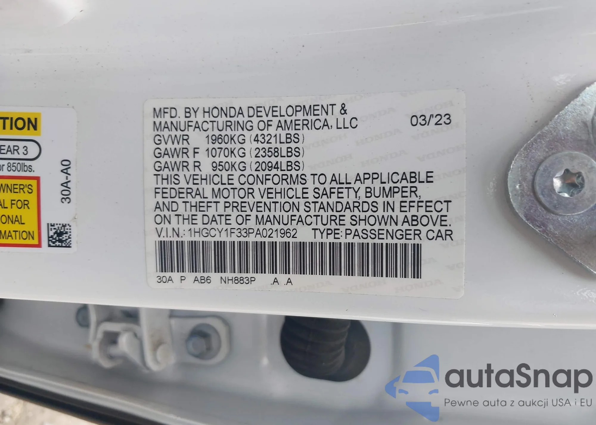 LOT: 42427477 VIN: 1HGCY1F33PA021962