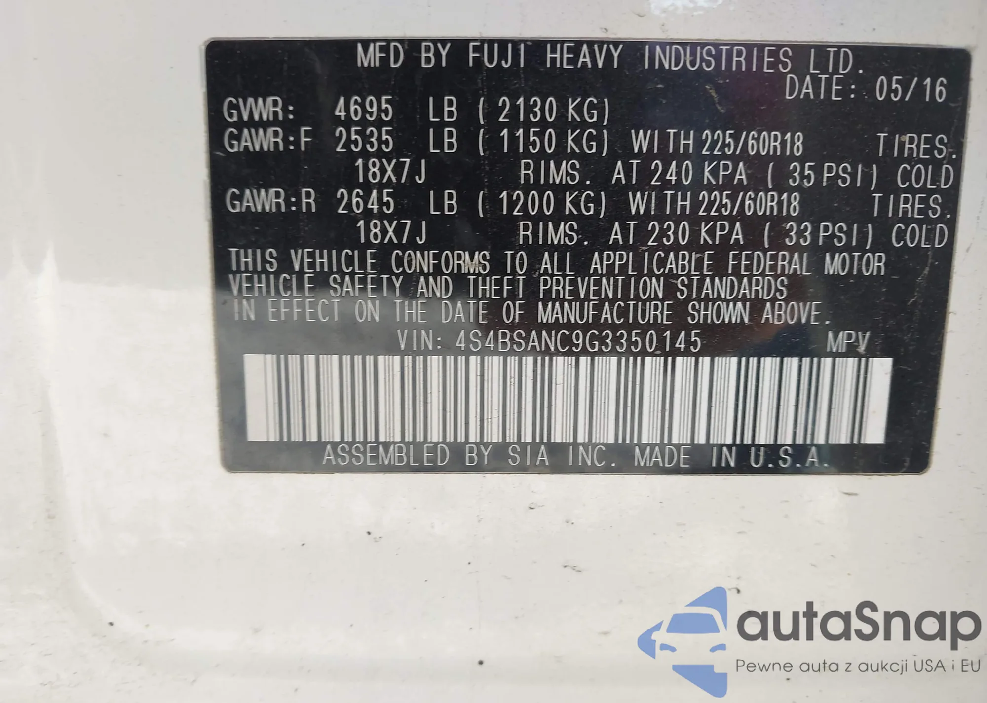LOT: 43326078 VIN: 4S4BSANC9G3350145