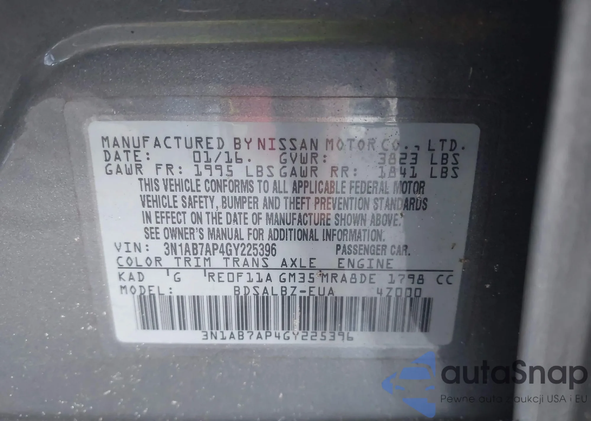 LOT: 43653068 VIN: 3N1AB7AP4GY225396