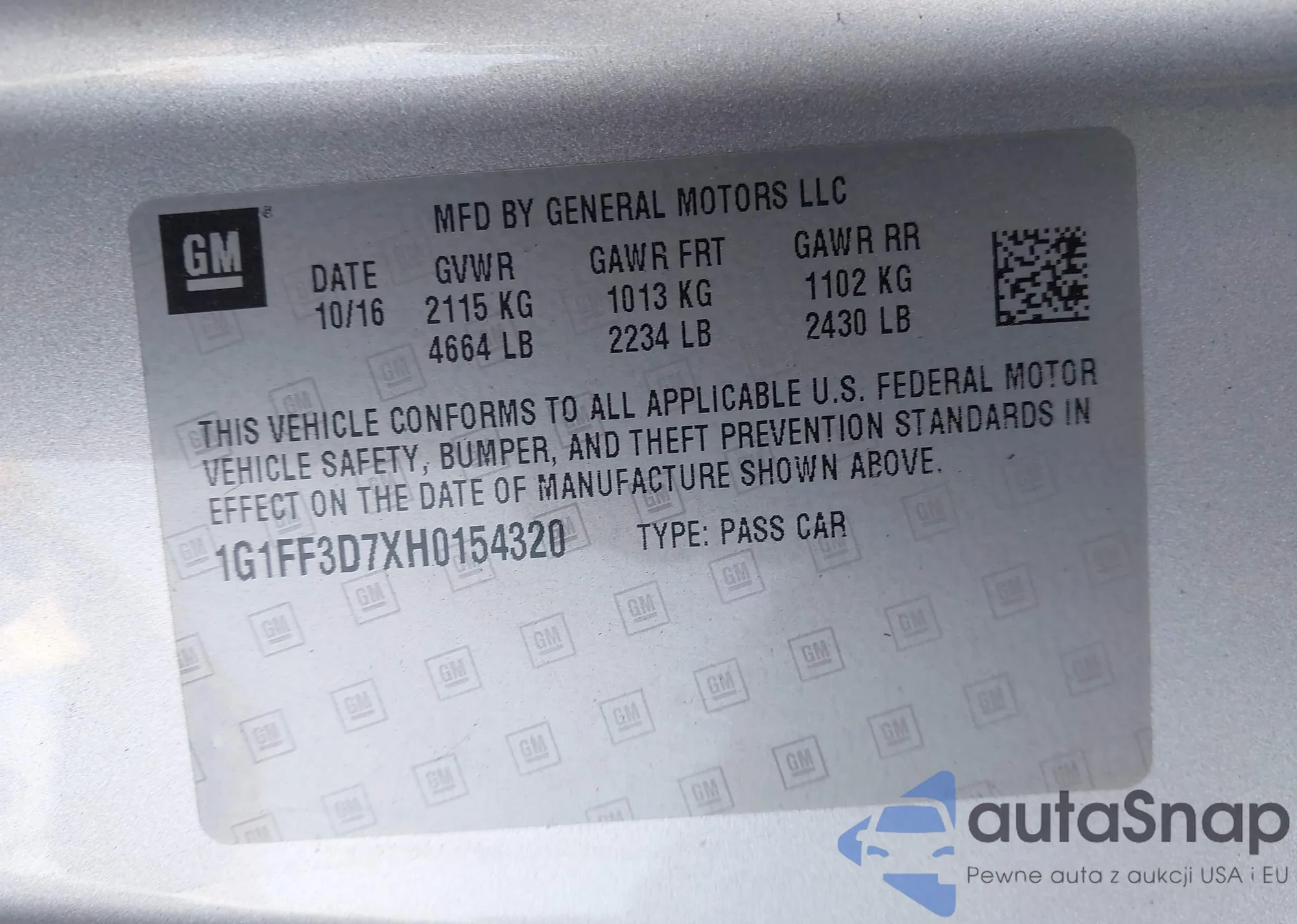 • VIN 1G1FF3D7XH0154320