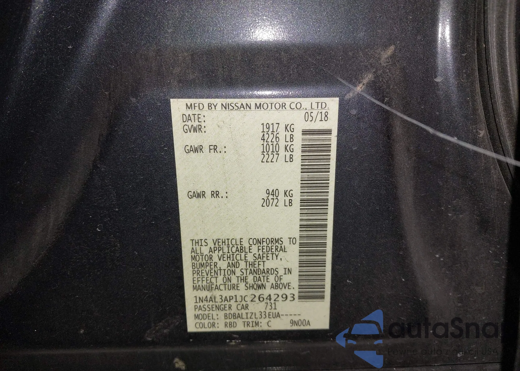 LOT: 43500893 VIN: 1N4AL3AP1JC264293