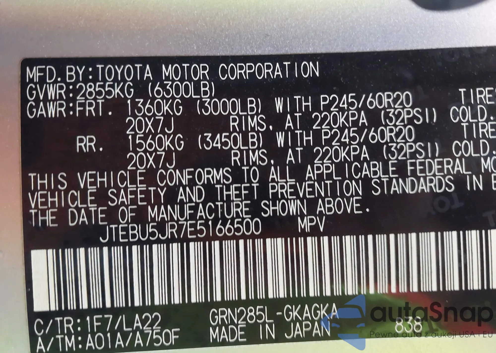 LOT: 43282502 VIN: JTEBU5JR7E5166500