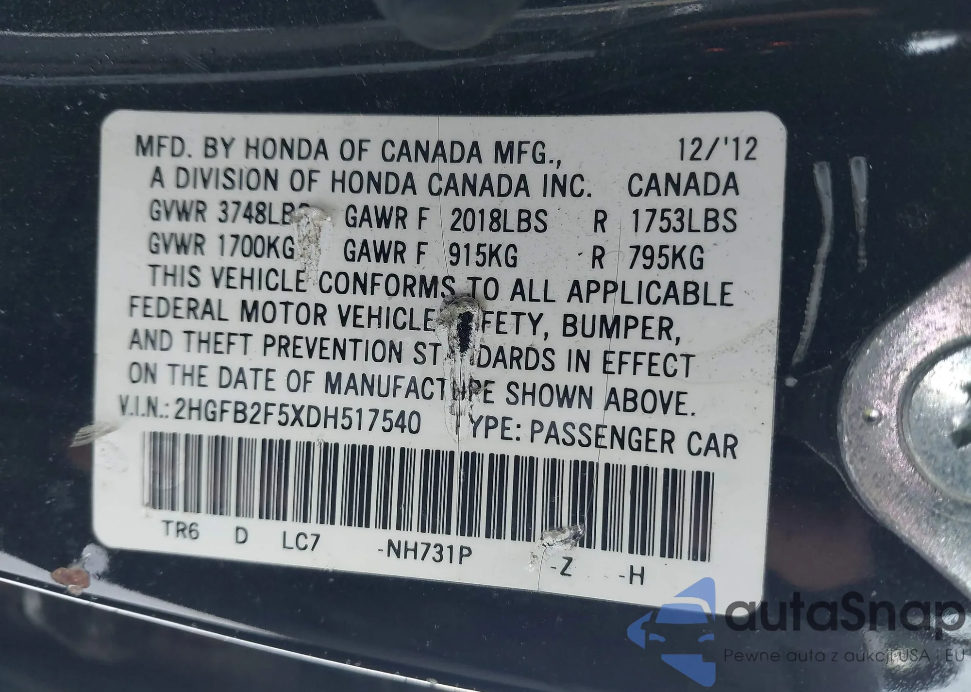 LOT: 43821597 VIN: 2HGFB2F5XDH517540