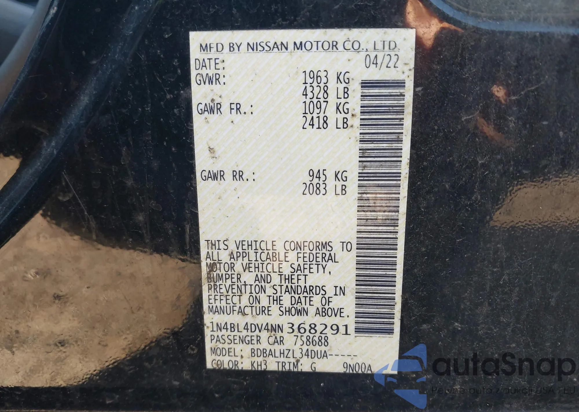• VIN 1N4BL4DV4NN368291