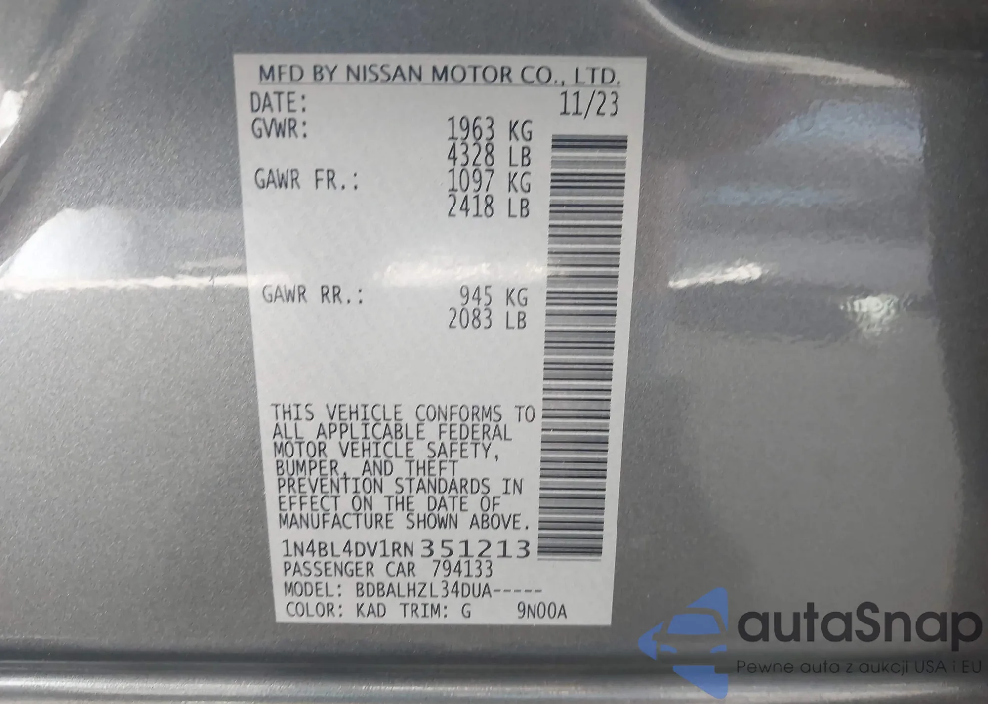 LOT: 43192775 VIN: 1N4BL4DV4NN368291