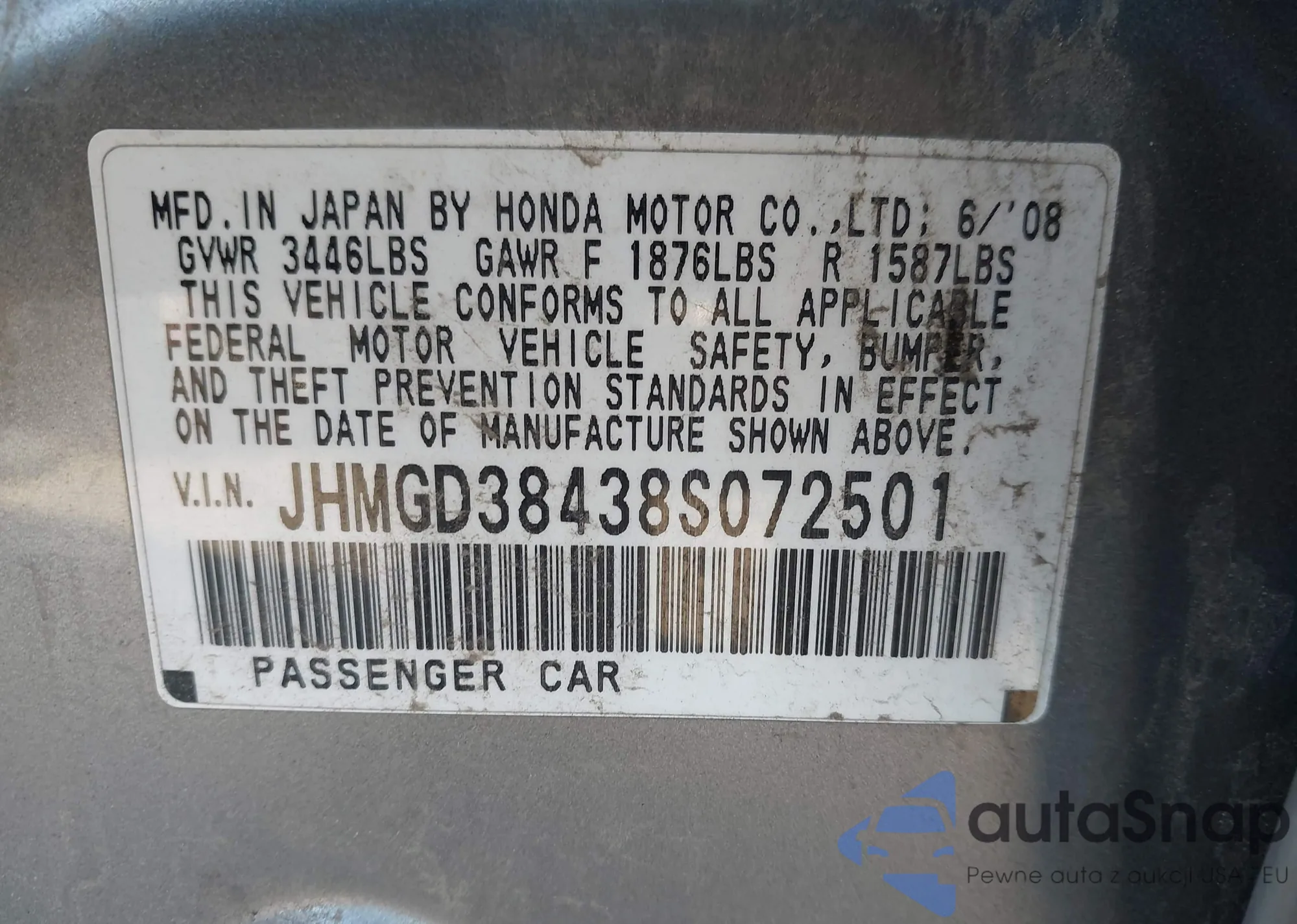 LOT: 43540587 VIN: JHMGD38438S072501