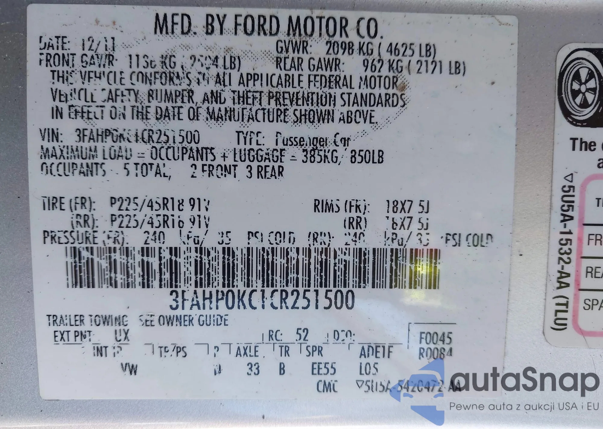 LOT: 43705085 VIN: 3FAHP0KC1CR251500