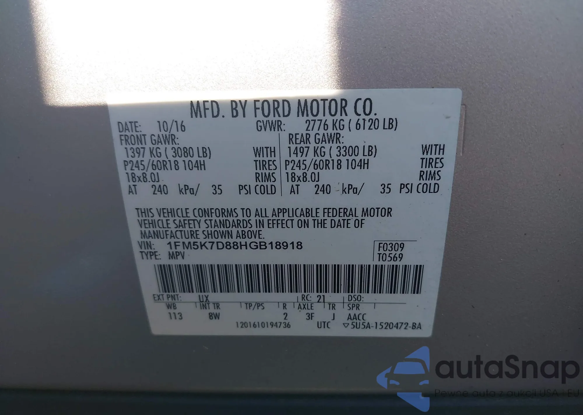 LOT: 43149428 VIN: 1FM5K7D88HGB18918