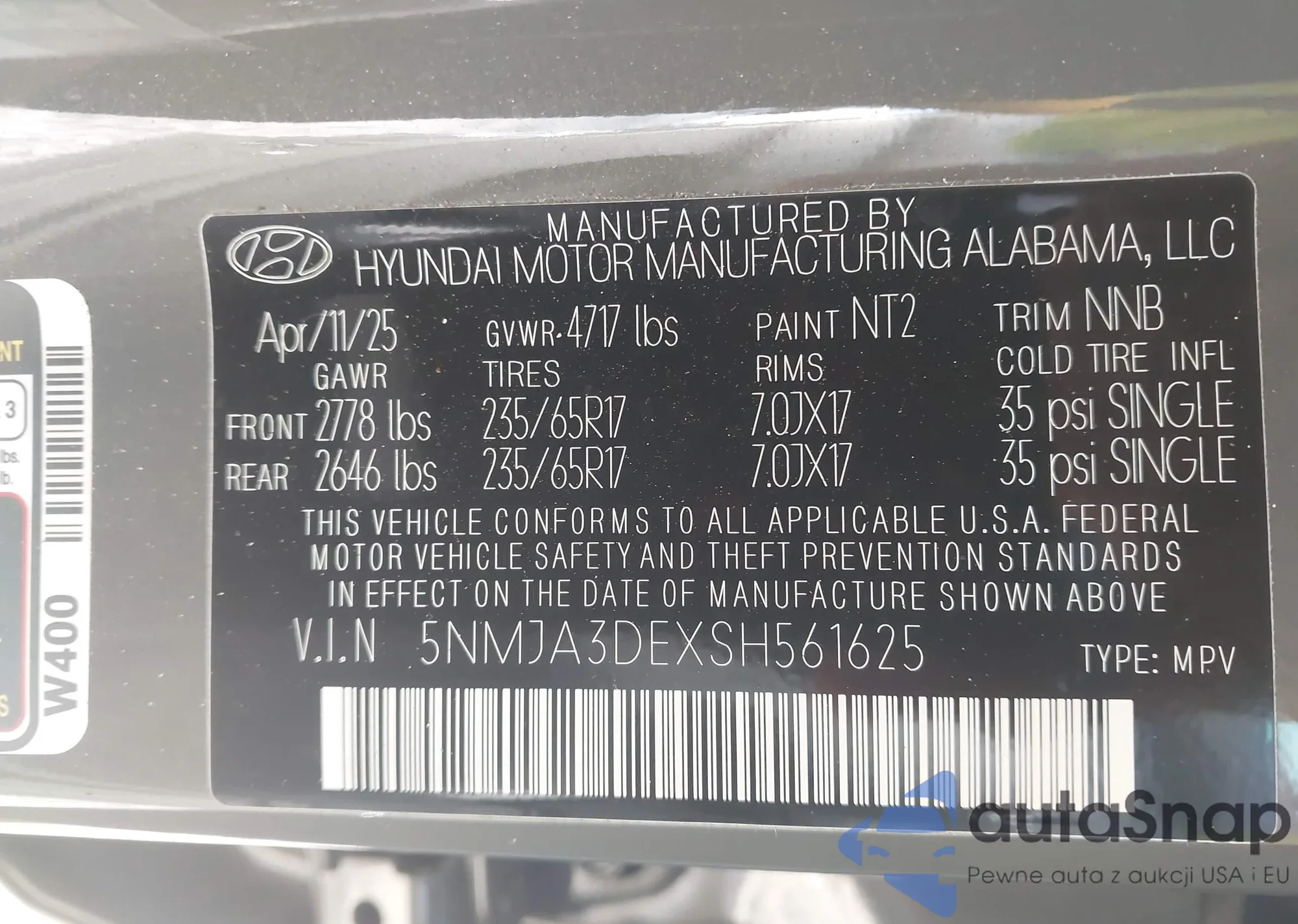• VIN 5NMJA3DEXSH561625