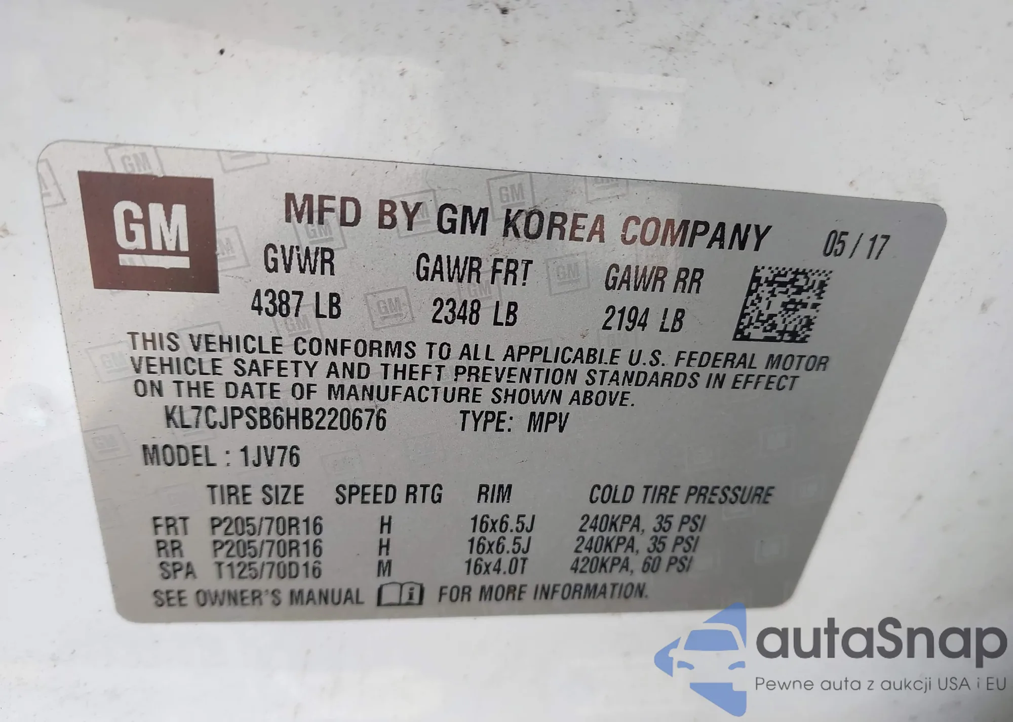 • VIN KL7CJPSB6HB220676
