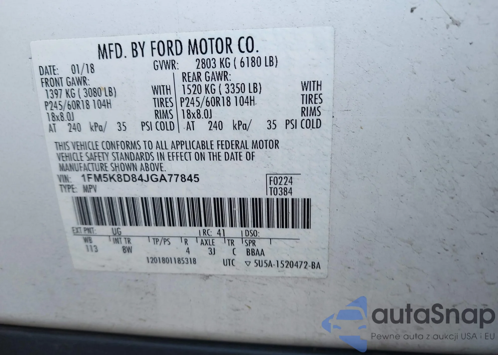 LOT: 43527333 VIN: 1FM5K8D84JGA77845