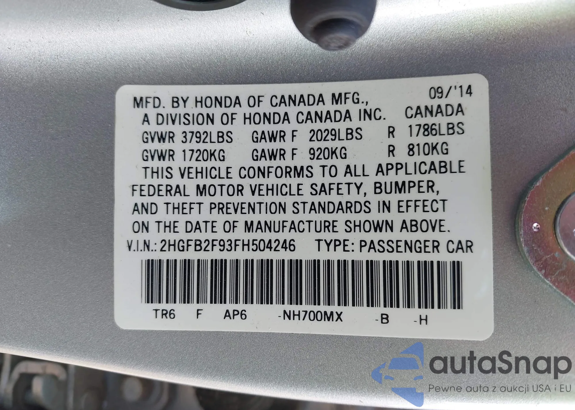 • VIN 2HGFB2F93FH504246
