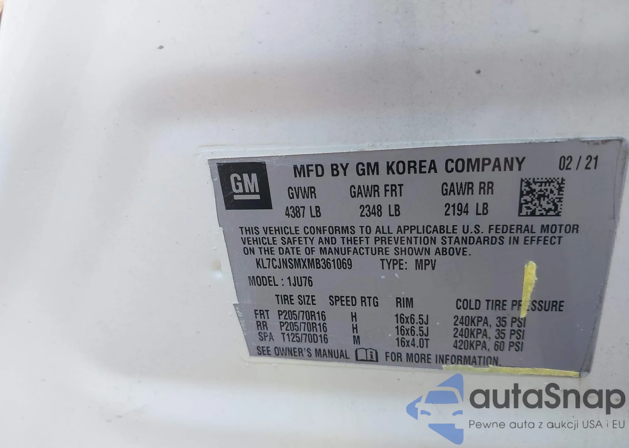 • VIN KL7CJNSMXMB361069
