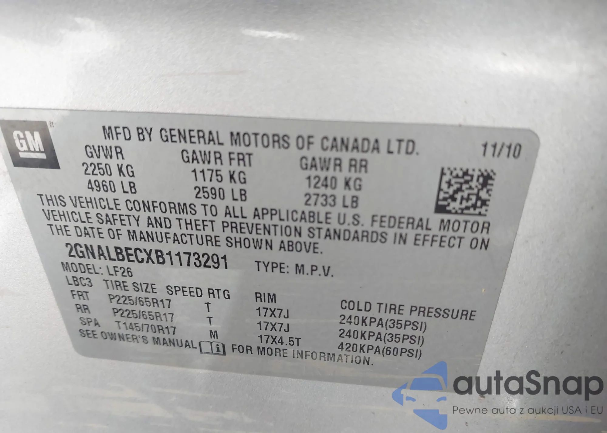 LOT: 43585358 VIN: 2GNALBECXB1173291