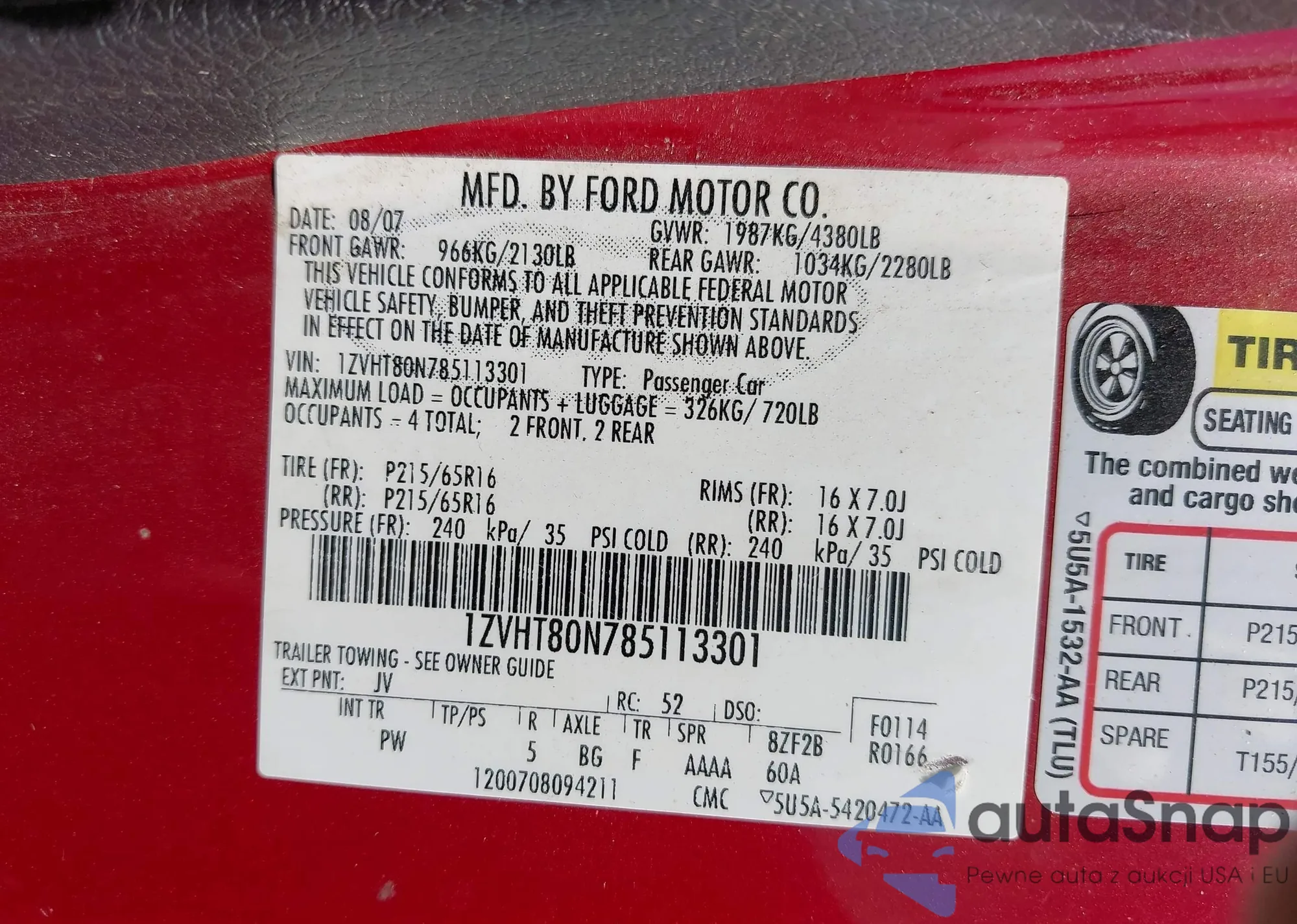 LOT: 43310093 VIN: 7FARS6H88TE005276