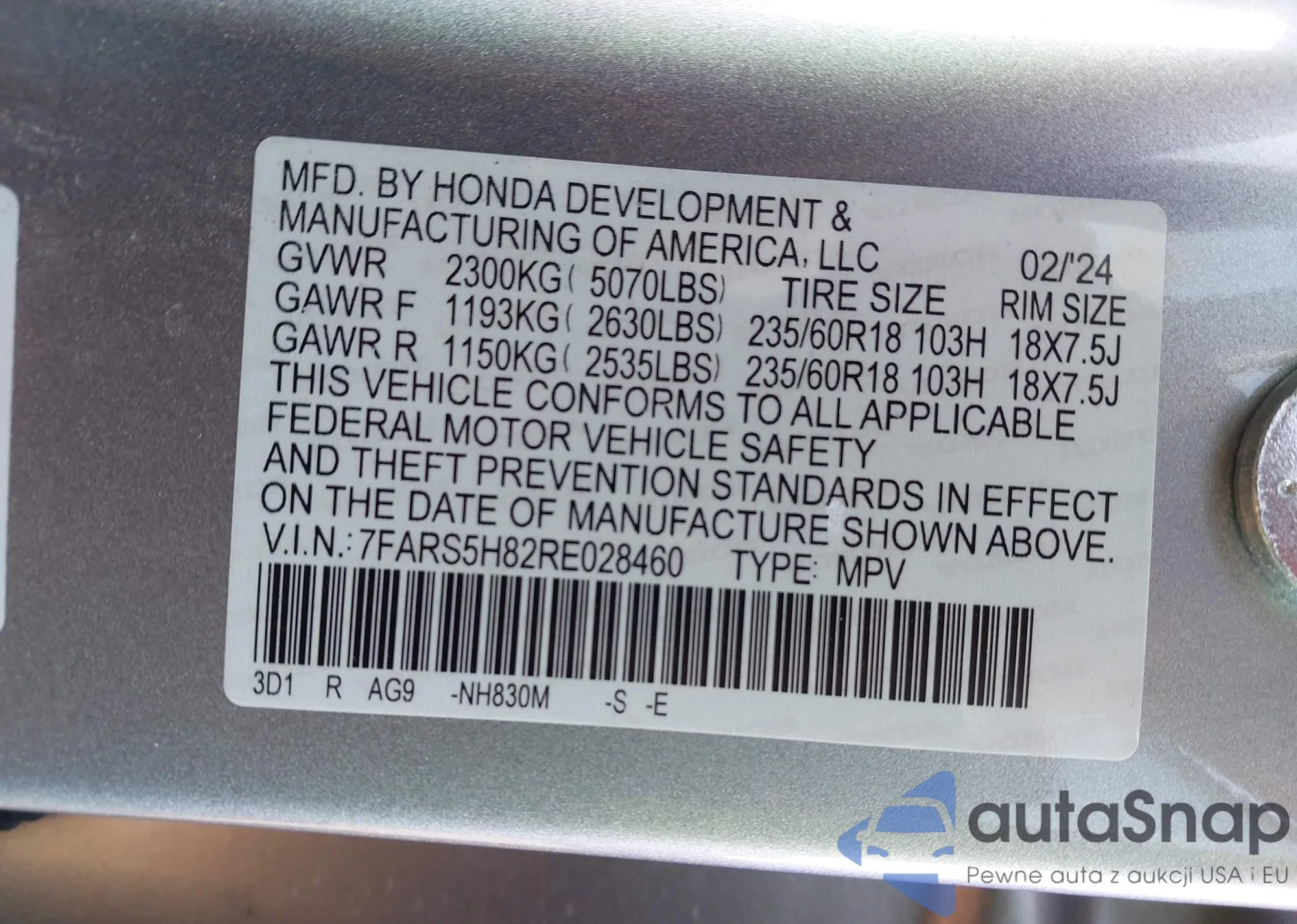 LOT: 43238536 VIN: 7FARS5H82RE028460