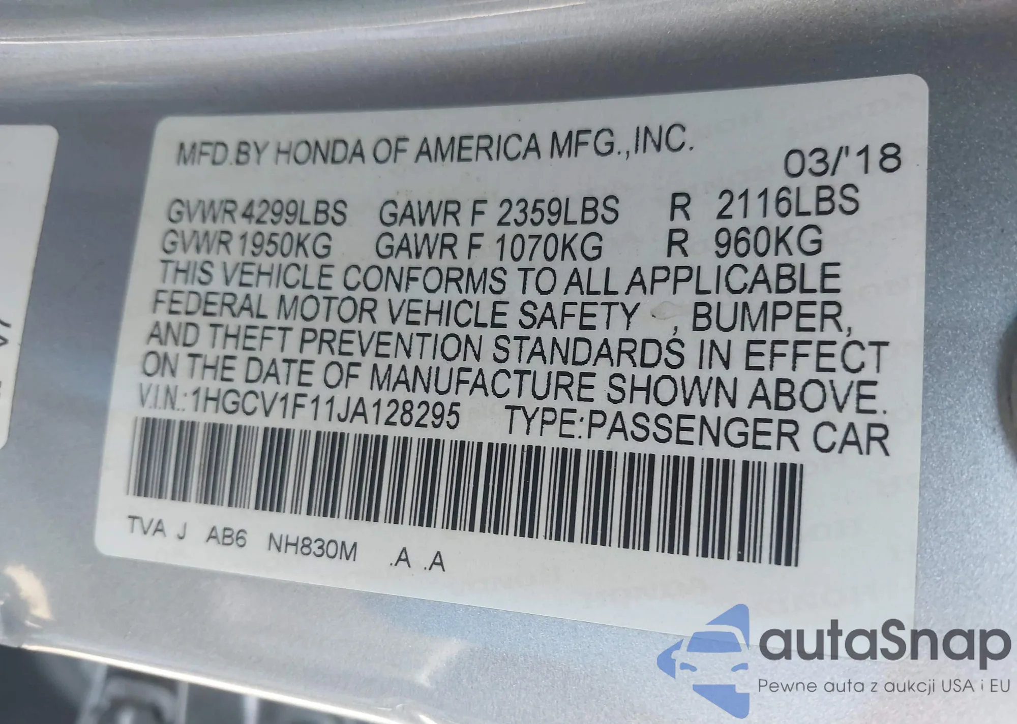 LOT: 43258593 VIN: 1HGCV1F11JA128295