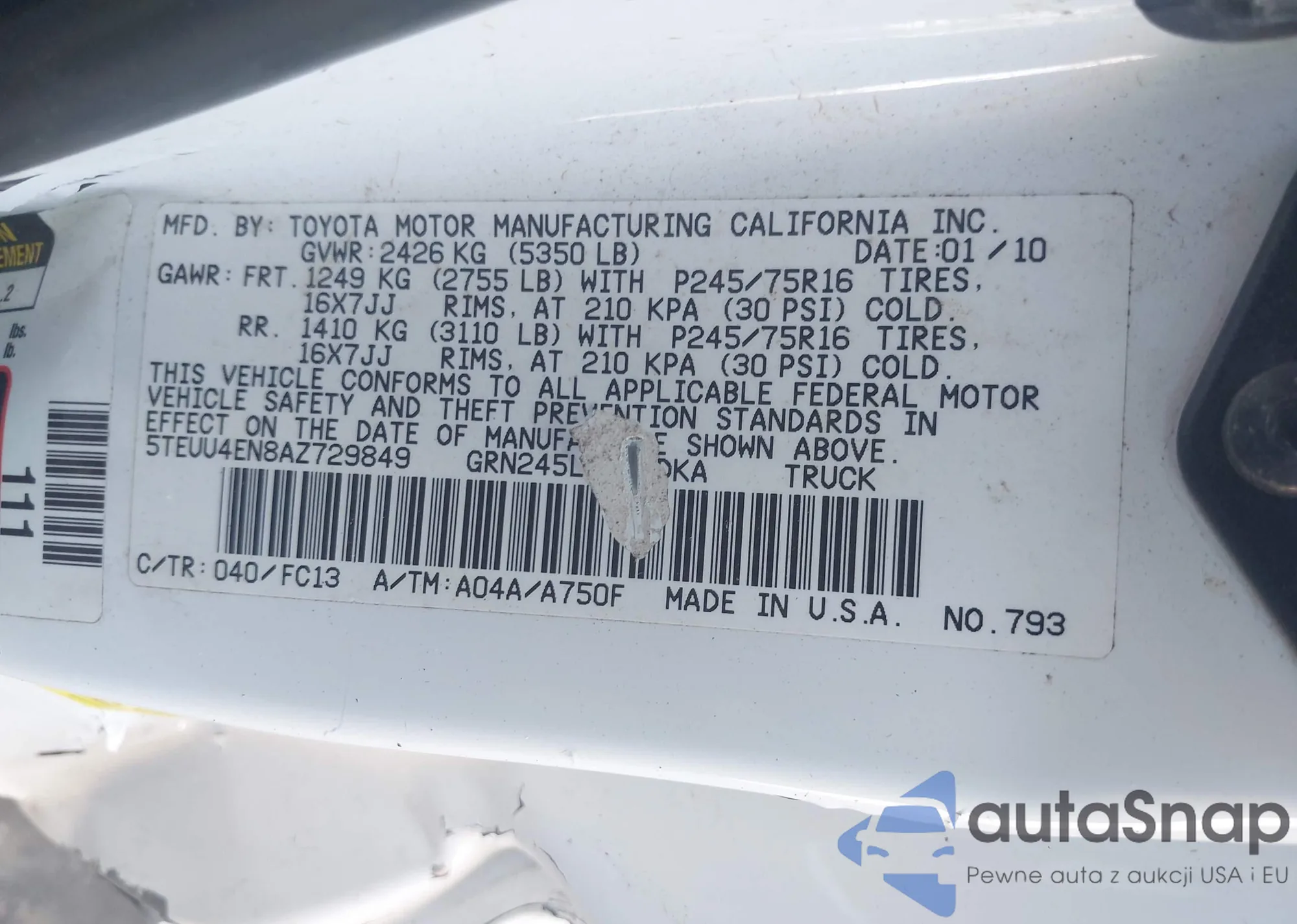• VIN 5TEUU4EN8AZ729849